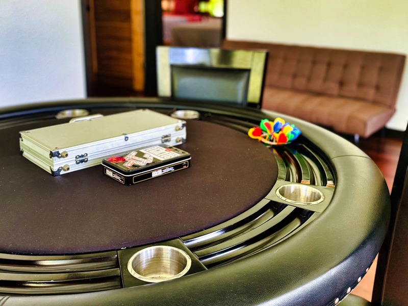 The centerpiece is a stunning duplex-style main building (two-story) with 6 spacious bedrooms (3 on each floor), providing ample accommodation for larger groups or families. The downstairs level features a fully equipped kitchen and a comfortable living area, ideal for relaxed gatherings and meal preparation. Upstairs, entertain in style with a dedicated game area complete with a poker table, dartboard, large-screen TV, and plenty of cozy, comfortable seating for movie nights or friendly competitions.