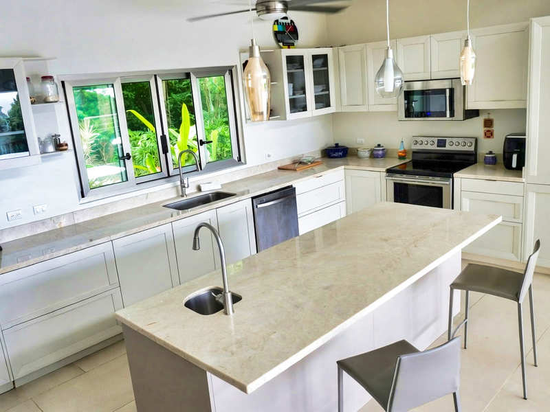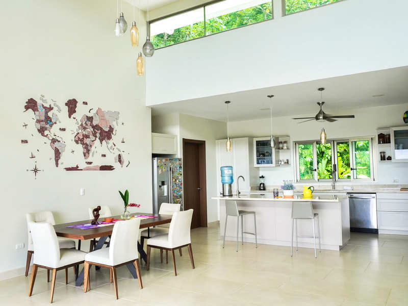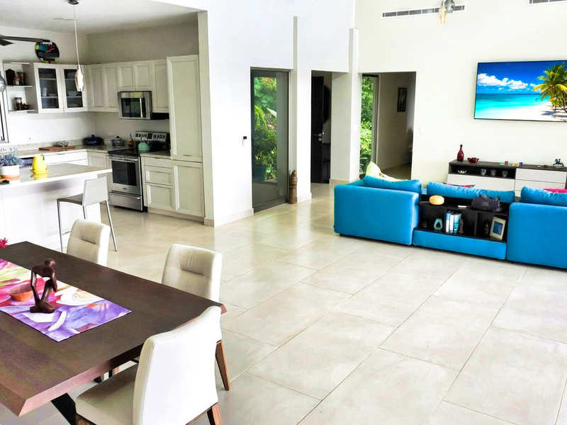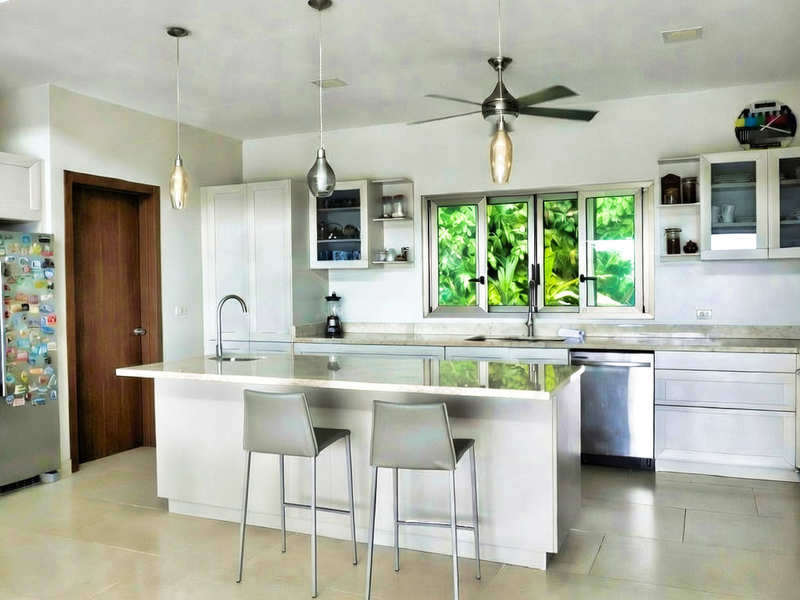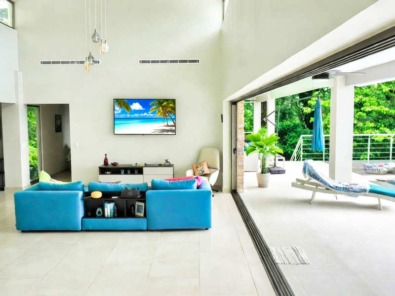 Built in late 2020 on an elevated plateau, the primary home enjoys commanding panoramic views of the Caribbean Sea, enveloped by dense tropical rainforest and serene natural surroundings. Accessible via a private, solar-illuminated driveway bordered by meticulously landscaped gardens, this single-level brick residence provides 366 square meters of refined interior living space, complemented by 122 square meters of integrated outdoor areas designed for seamless relaxation.