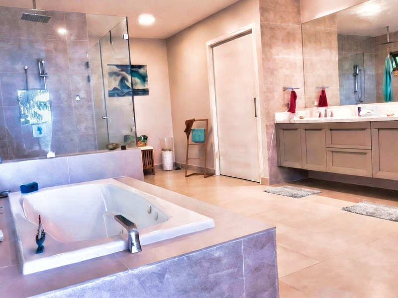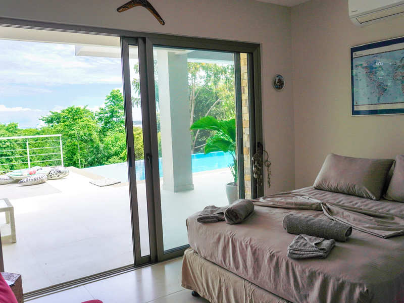 The accommodation highlights a spacious master suite with king-size bedding, direct terrace access, and unobstructed ocean vistas through expansive glass doors. It includes an 18-square-meter walk-in wardrobe with climate control and an en-suite bathroom with a rain shower, double vanities, a private toilet, and a jacuzzi tub. Two additional guest bedrooms, each with a queen-size bed and built-in storage, offer views of the pool and gardens, and each is served by a full bathroom and a convenient powder room.