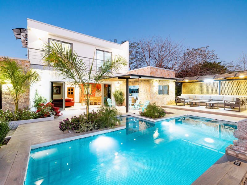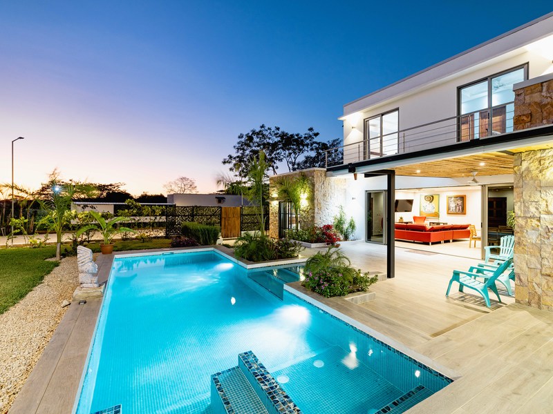 Casa Jasmine 1: A spacious 3-bedroom, 3.5-bathroom home with two floors. Enjoy a stunning pool, wet bar, outdoor lounging area, and a large terrace with a balcony on the second floor.