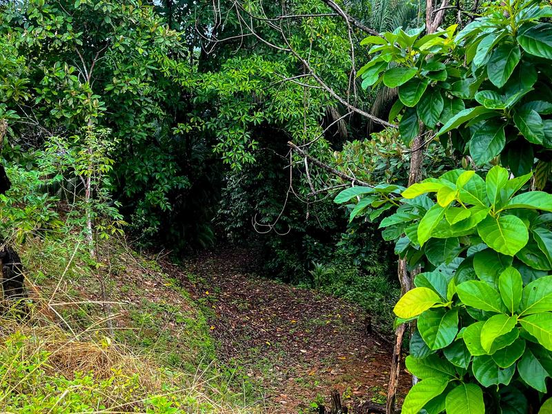 The property features a large, flat building area already partially landscaped and surrounded by lush, vibrant jungle teeming with wildlife. A rustic dwelling currently sits on the land, providing immediate shelter or a base for construction. Its private location offers peace and tranquility, yet remains easily accessible from a public road and just a short drive to town, local amenities, restaurants, and the water taxi.