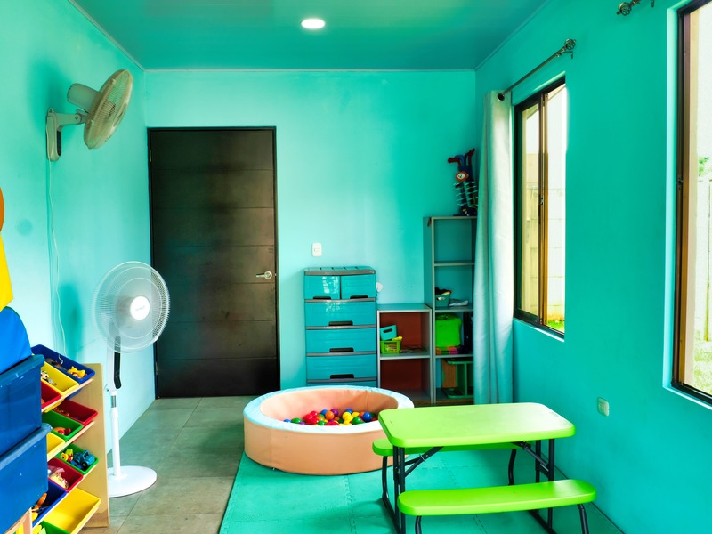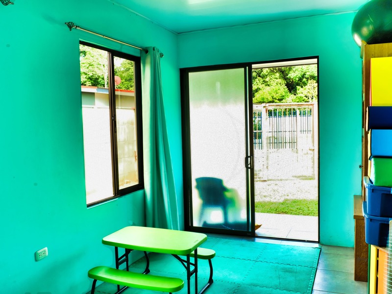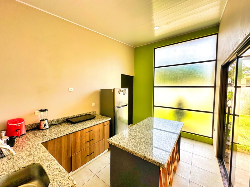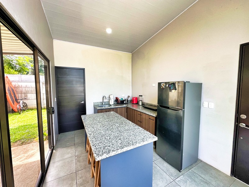 Spanning 646 square feet on a generous 275-square-meter lot, the residence features durable construction with high aluminum frames, ensuring longevity and low maintenance in the tropical climate. Step inside to find a versatile living area currently utilized as an educational space for children with special needs—easily convertible back to a cozy living room for relaxation or entertaining. The well-appointed kitchen boasts essential appliances, including a refrigerator, stove, and oven, complemented by a practical island with a non-granite countertop, perfect for meal prep or casual dining.