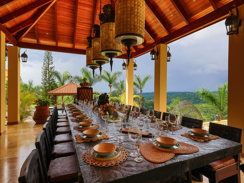 The main custom-made dining table is fit for a king's banquet and seats 22 guests. There is also a breakfast table for 10, an immense covered BBQ area, and a sculptured fish pool to be stocked with coy.