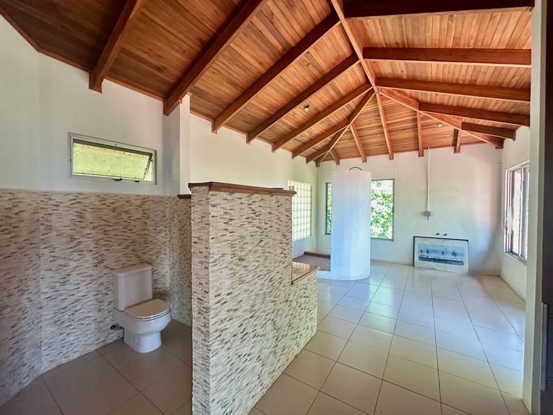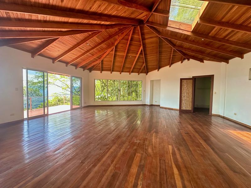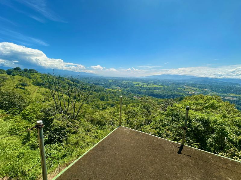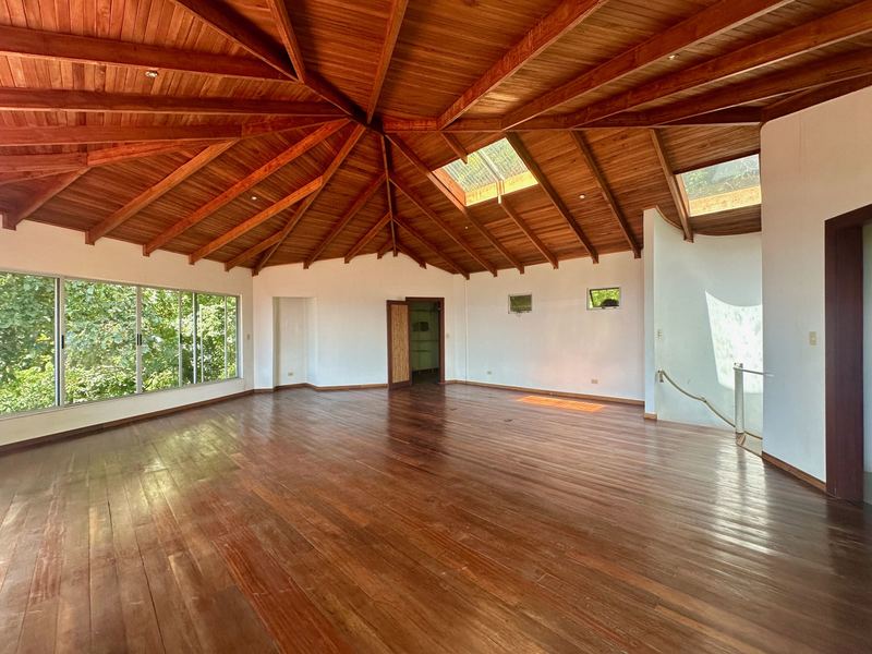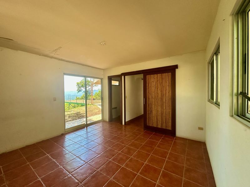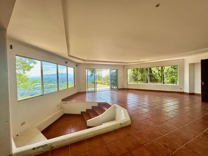 This exceptional property offers more than 11,000 m² (about 2.7 acres) with sweeping panoramic views over the Central Valley; on clear days, you can see the Irazú and Turrialba volcanoes. The solid house, built 15 years ago, provides a sound structural base and spacious living. The ground floor contains an open-plan kitchen, dining, and living area with large windows, a laundry room, one bedroom, a bathroom, and a generous outdoor terrace that frames the valley. Upstairs is a huge master bedroom with high wooden ceilings, a walk-in closet, and a large bathroom with room to add a bathtub. The sloped lot also includes three additional flat platforms suitable for guest houses or rental units. With some renovation, this property is ideal as a private home or an income-producing project.