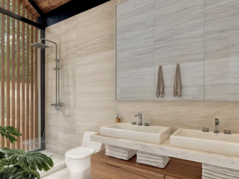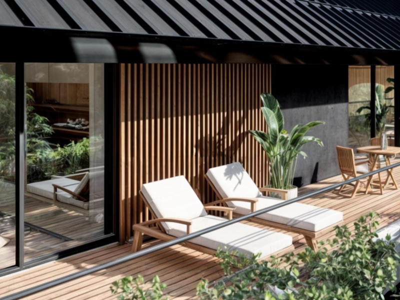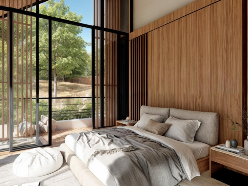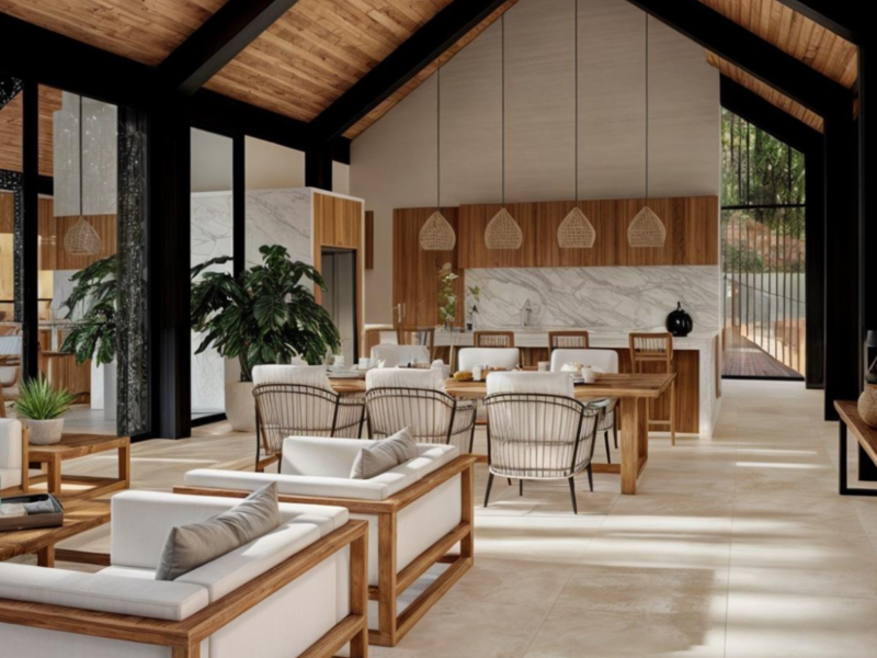 • Includes solar panels and battery systems for energy efficiency. • Rainwater Management: The sloped roof and landscaping efficiently direct rainwater to reduce soil erosion and support local biodiversity. • Minimal Land Disruption: Construction and site planning prioritize the preservation of existing flora and fauna. • Optimized Natural Lighting: Floor-to-ceiling windows and open layouts reduce the need for artificial lighting during the day. • Durable Finishes: Use of high-quality, long-lasting materials such as porcelain tile and teak wood, ensuring longevity and reducing waste. • Thermal Comfort: Designed for the tropical climate with materials and architectural solutions that naturally moderate interior temperatures. • Passive Cooling Design: Strategically positioned to leverage natural airflow and cross-ventilation, minimizing the need for artificial cooling systems. • Movable Architectural Elements: Adaptable walls allow control over natural light, shade, and airflow to enhance energy efficiency. • Elevated Structure: Designed on a raised platform to adapt to the site’s terrain while protecting the natural ecosystem beneath. • Energy Efficiency: The home’s layout and design reduce reliance on energy-intensive systems, supporting a lower carbon footprint. • Sustainable Materials: Utilization of natural and locally sourced materials such as teak wood and stone, reducing transportation emissions.