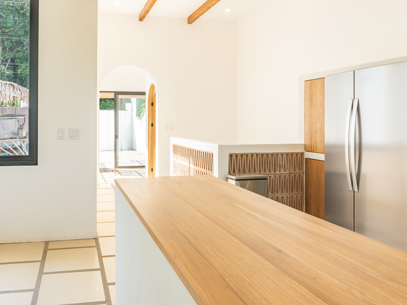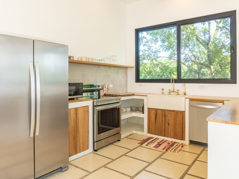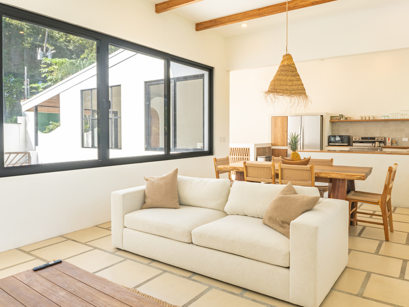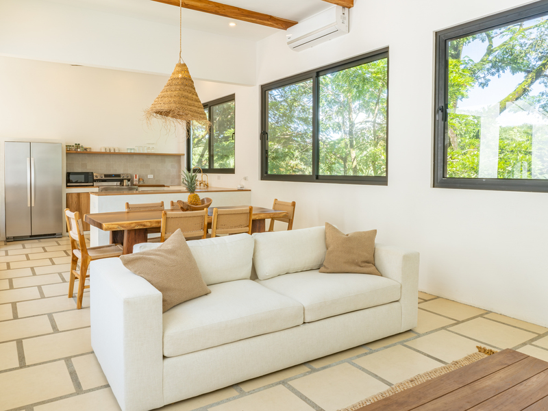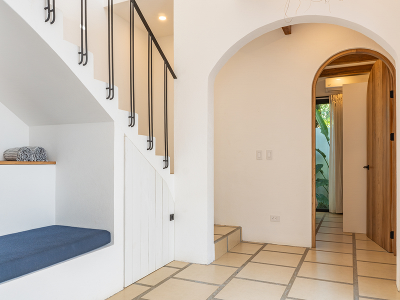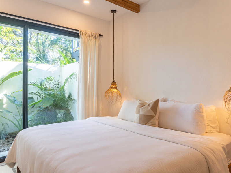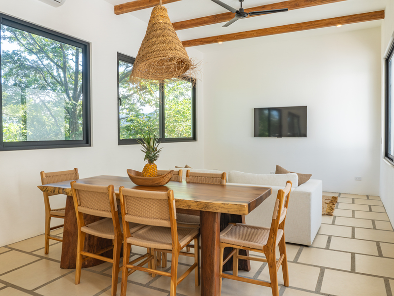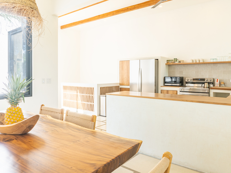Spread across two levels, Villa Indy effortlessly combines luxury, function, and warmth. The main floor features a modern kitchen with stainless steel appliances, a handmade concrete sink with Moroccan faucets, and custom light fixtures. The dining area showcases a Guanacaste wood table and handmade Teca furnishings that enhance the villa’s natural aesthetic. A guest half bath and laundry area with washer and dryer complete this level.
