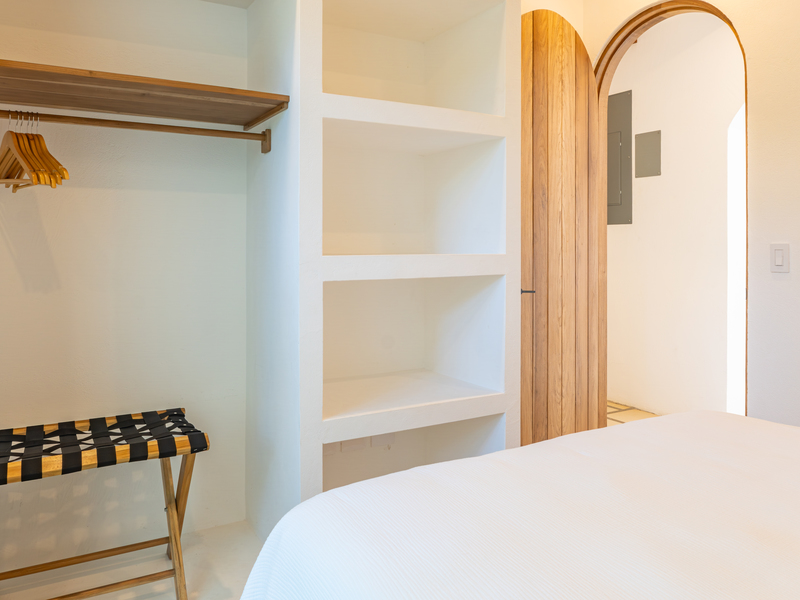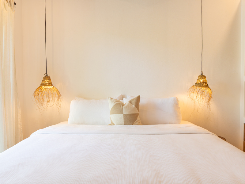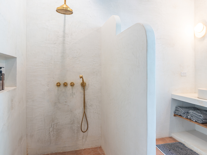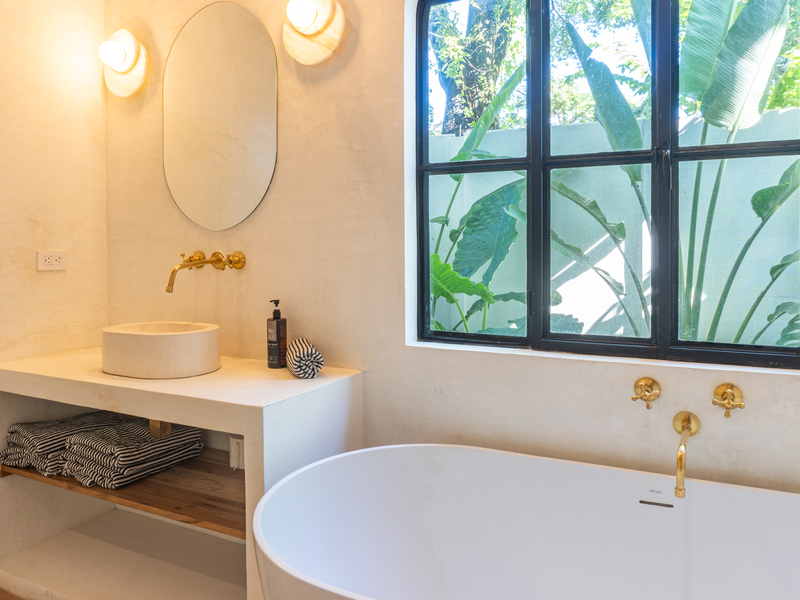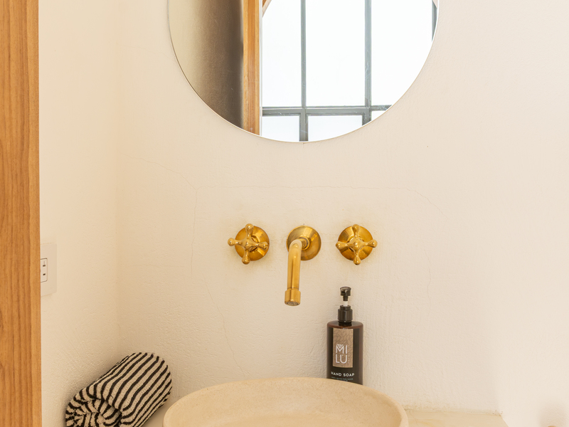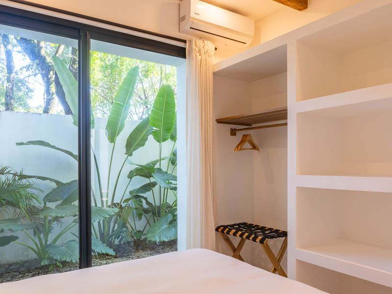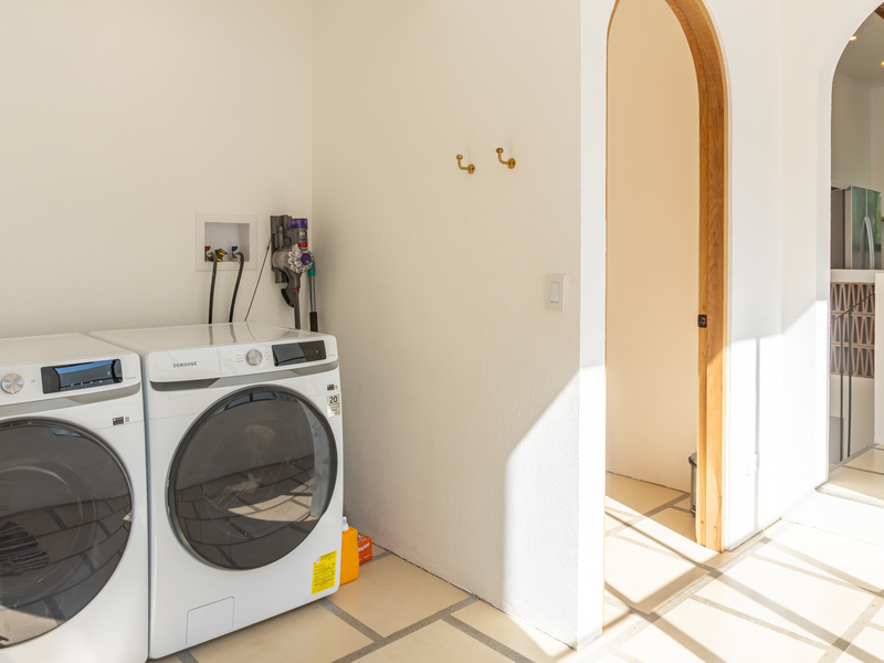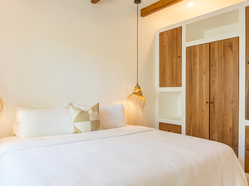 Spread across two levels, Villa Indy effortlessly combines luxury, function, and warmth. The main floor features a modern kitchen with stainless steel appliances, a handmade concrete sink with Moroccan faucets, and custom light fixtures. The dining area showcases a Guanacaste wood table and handmade Teca furnishings that enhance the villa’s natural aesthetic. A guest half bath and laundry area with washer and dryer complete this level.