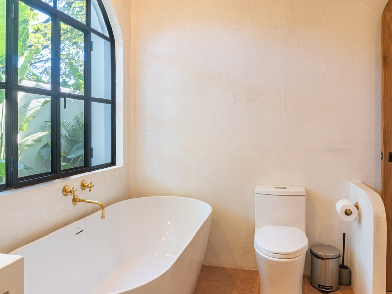 A semi-spiral staircase leads to the lower level, where two spacious bedrooms open directly onto a lush private garden. Each room includes custom closets and sliding patio doors that provide direct access to the saltwater pool and outdoor lounge area. The bathroom exudes European-inspired elegance, featuring a freestanding bathtub and Moroccan fixtures — the perfect setting for relaxation and rejuvenation.