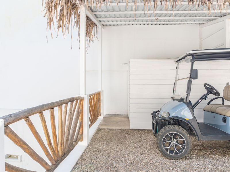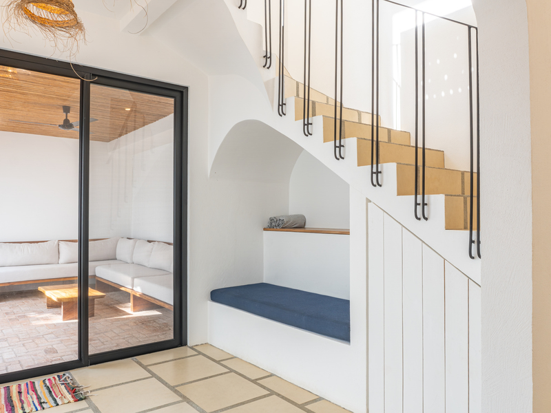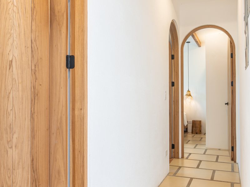 Passing through the private gate, you’ll find a dedicated parking space for your golf cart — conveniently included in the sale. Inspired by the serene courtyards of a traditional riad, the home is centered around a tranquil internal courtyard featuring a saltwater pool. Refined architectural details abound, including upgraded windows and doors, teak ceiling beams, and distinctive Celosia brickwork designed by renowned Spanish architect Patricia Urquiola, adding a distinctive artistic flair.