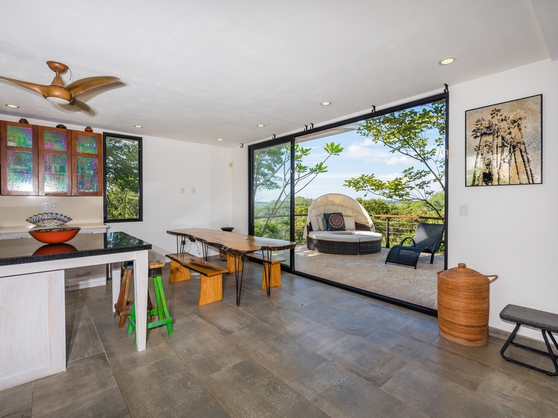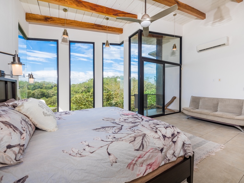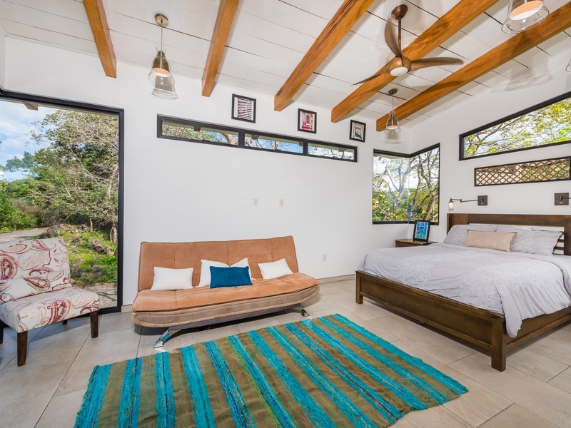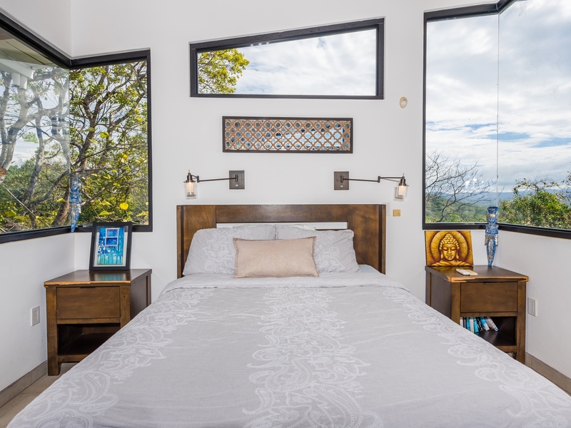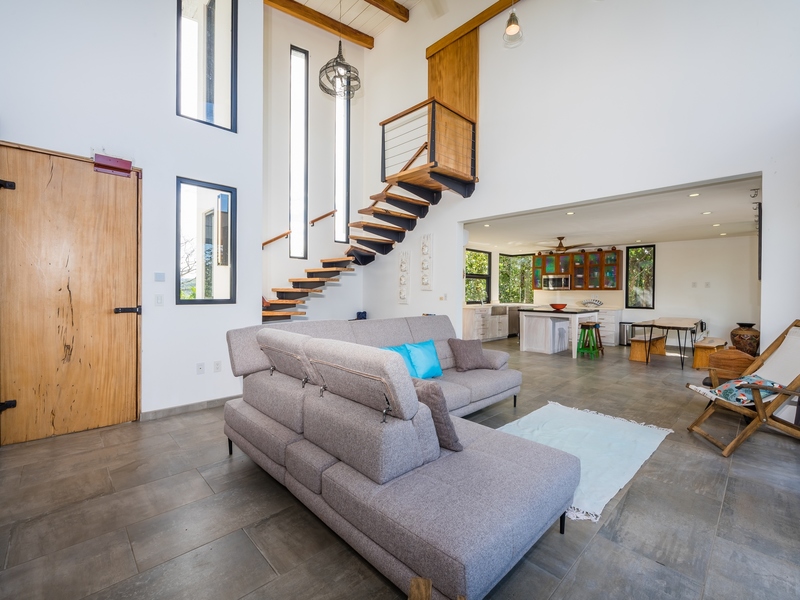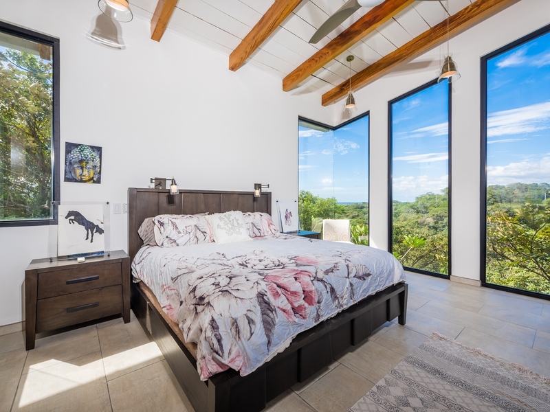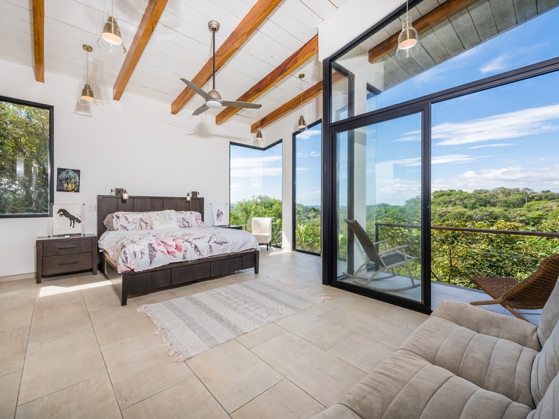 The two-story residence is fully furnished with high-end furniture and features two spacious bedrooms with private balconies overlooking the ocean and pool, plus two bathrooms. There is potential to add a third bedroom. The home’s kitchen, living, and dining areas are tastefully decorated, and it was built by American contractor Cody Qualls with Guanacaste wood, hurricane-proof windows, and custom cabinetry.