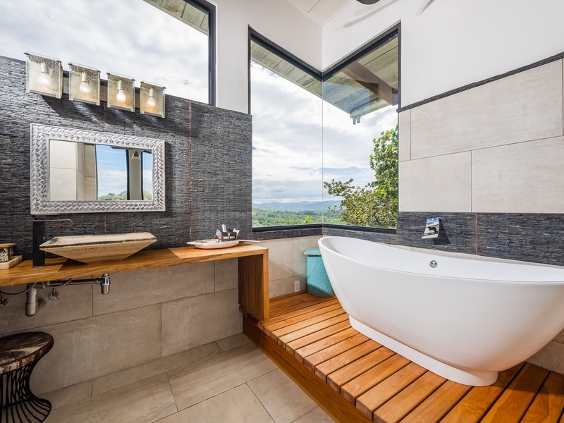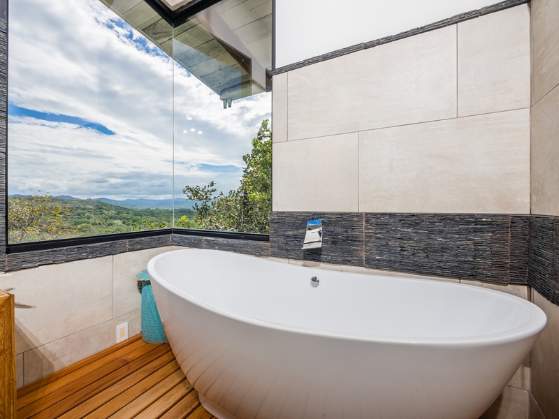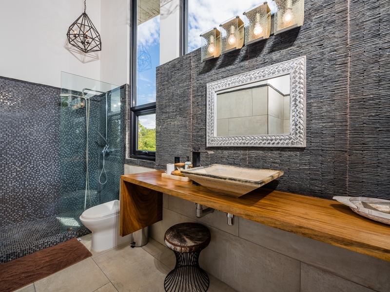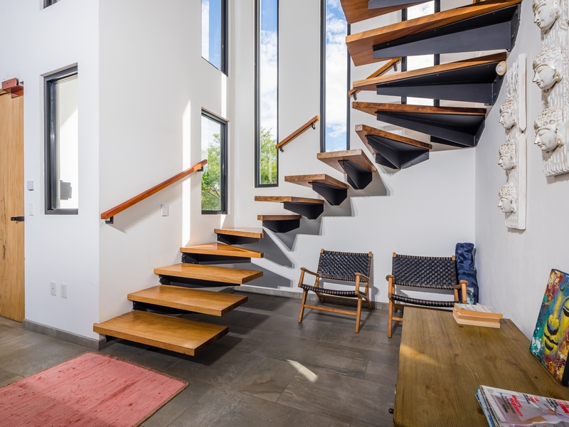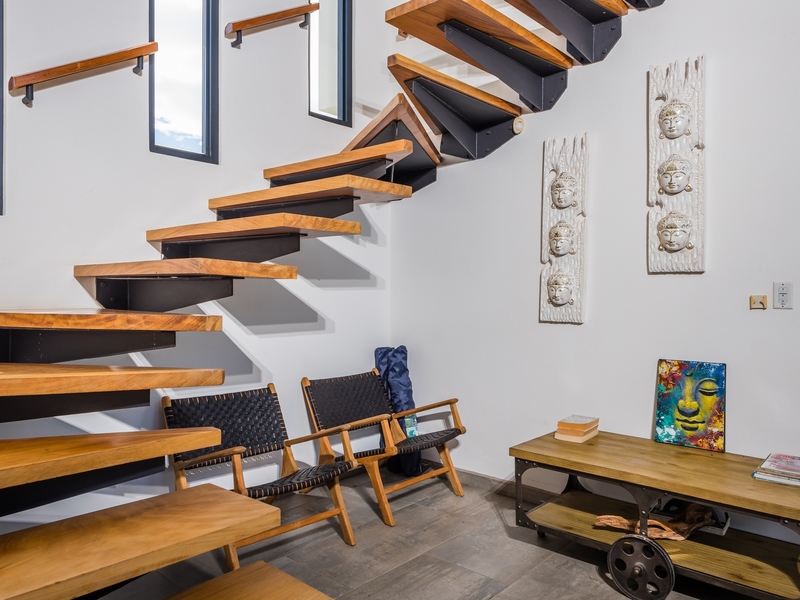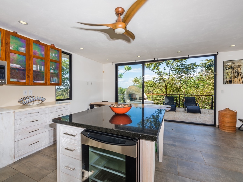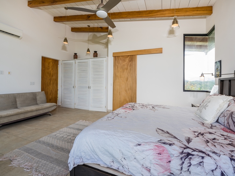 The two-story residence is fully furnished with high-end furniture and features two spacious bedrooms with private balconies overlooking the ocean and pool, plus two bathrooms. There is potential to add a third bedroom. The home’s kitchen, living, and dining areas are tastefully decorated, and it was built by American contractor Cody Qualls with Guanacaste wood, hurricane-proof windows, and custom cabinetry.