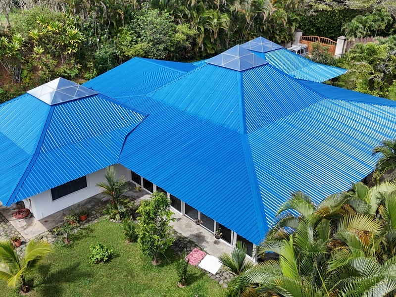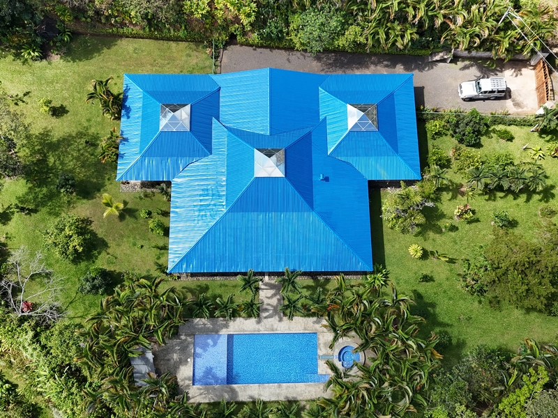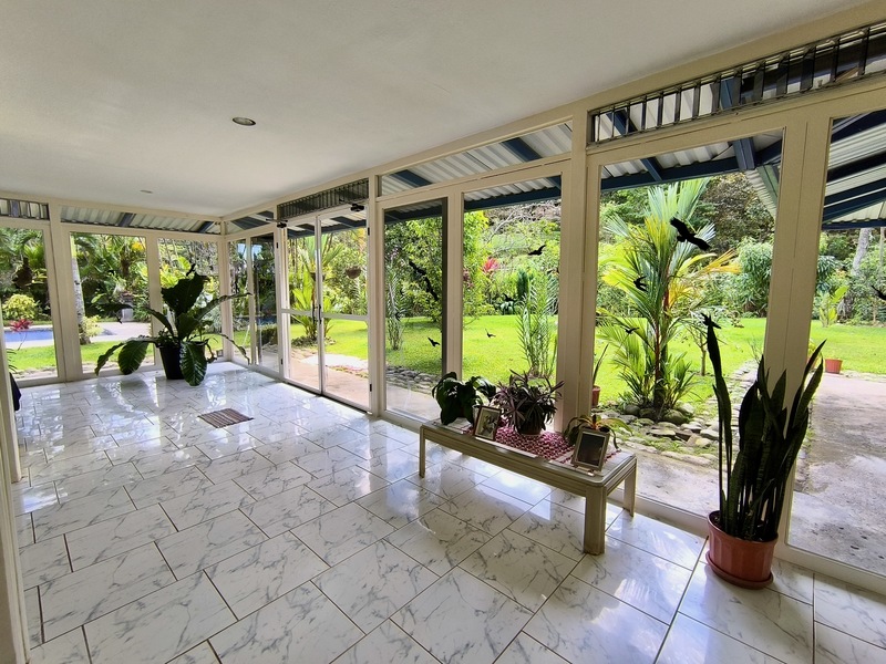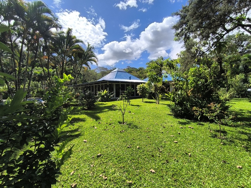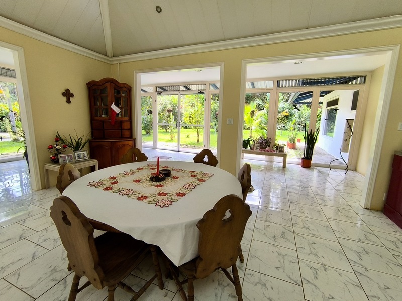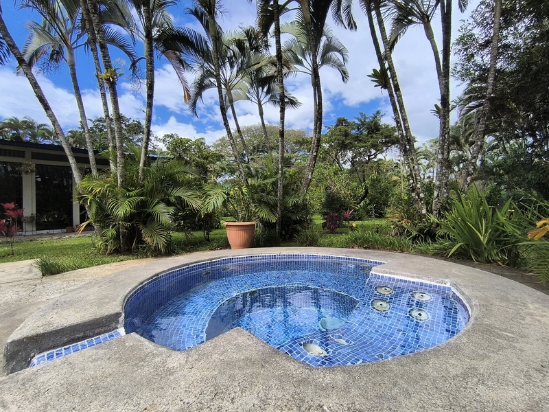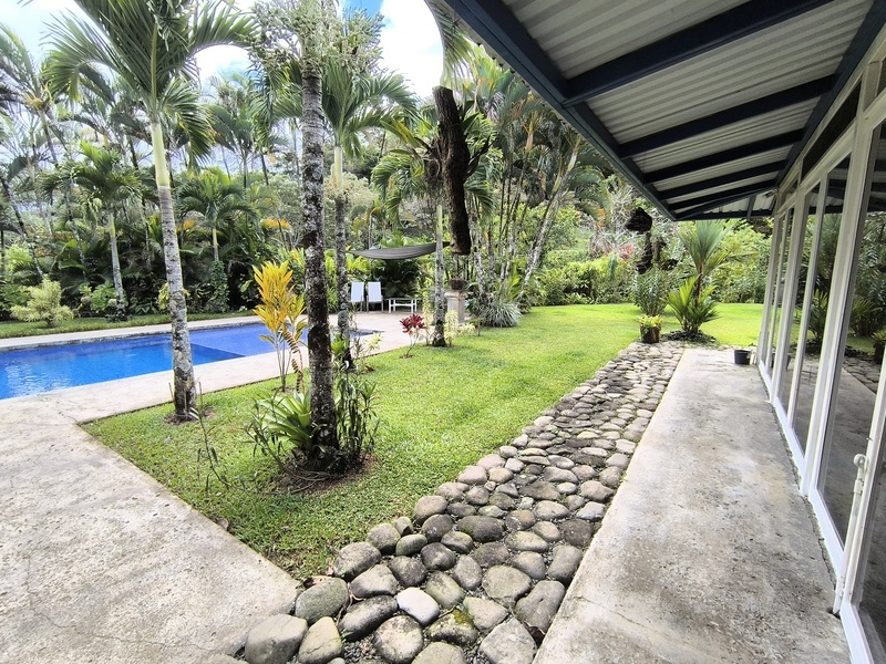 The main living area is bright and airy, featuring a skylight and large sliding glass doors. The master bedroom includes an en-suite bathroom and a walk-in closet, while two guest bedrooms on the opposite side of the house share a bathroom. Outdoor amenities include a large terrace overlooking an 11m x 5m swimming pool and a relaxing jacuzzi, as well as a 7,000 m² garden with lush greenery, fruit trees, and tropical plants. A covered carport accommodates three vehicles. The owner also offers the possibility of purchasing an adjacent property.