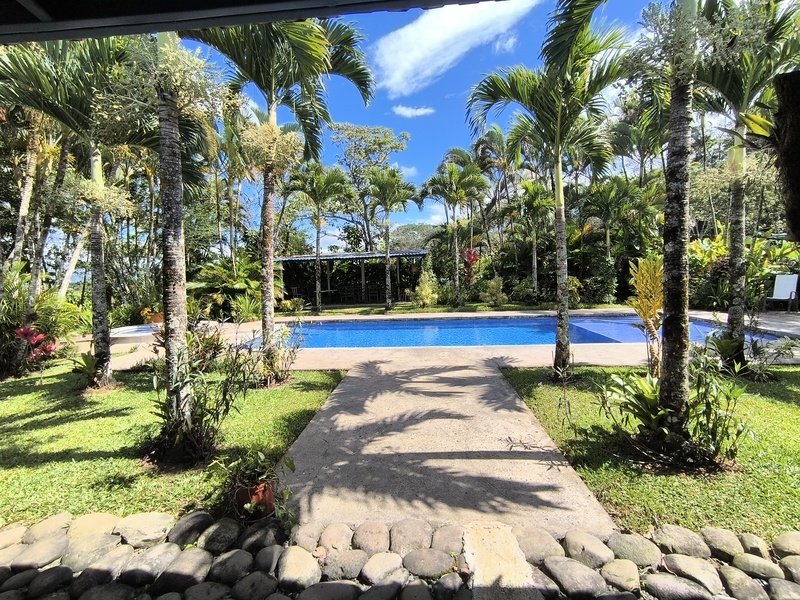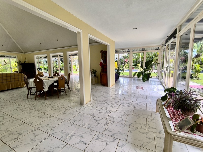 Property Features: • Single-story house in a private community of six homes • Master bedroom with en-suite bathroom and walk-in closet • Two guest bedrooms sharing one bathroom • Spacious open-plan living area with skylight and large sliding doors • Expansive terrace with views of the swimming pool and jacuzzi • 11m x 5m swimming pool and jacuzzi • 7,000 m² landscaped garden with fruit trees and tropical plants • Covered carport for three vehicles • Option to purchase adjacent property