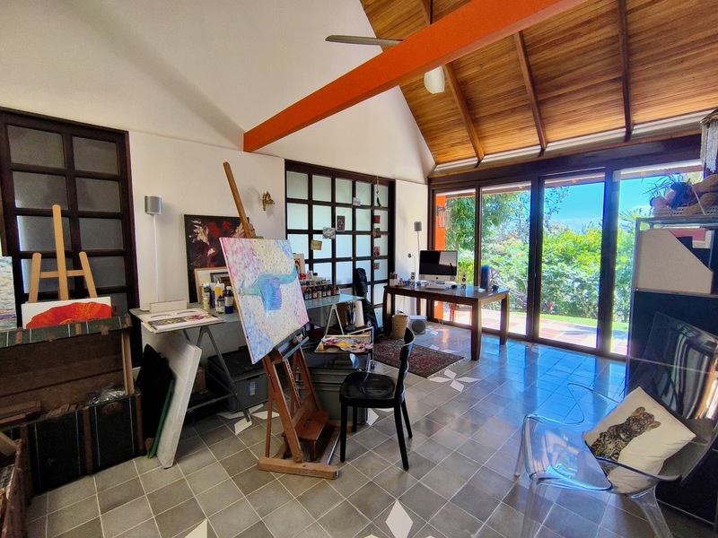 A second pavilion includes a spacious bedroom, refined bathroom, and an adjoining versatile room—currently an artist’s studio—that could easily become another bedroom, gym, or office. This pavilion also features an additional bedroom with its own en-suite bath. A separate structure pays homage to Balinese temple traditions, adding a spiritual dimension to the estate.
