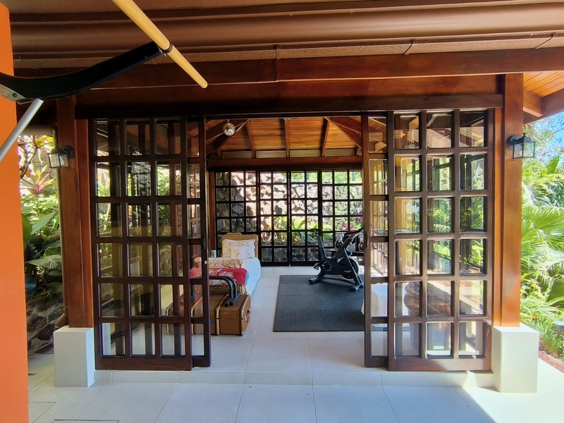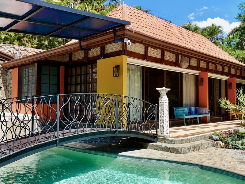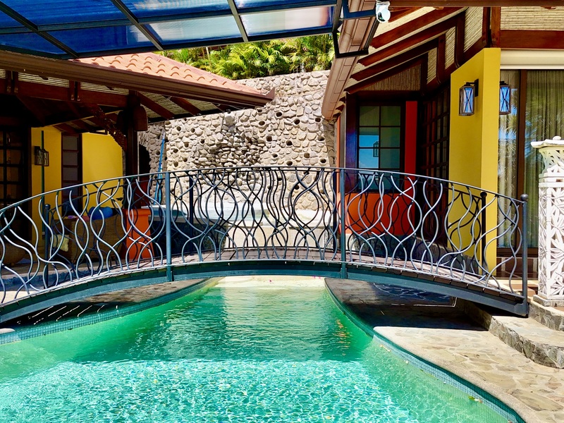 Outdoors, a pool with water features, a graceful iron bridge, textured stone walls, and tropical landscaping create an enchanting environment. Trails lead to a coffee plantation and a bamboo grove where the sound of towering bamboo swaying in the wind creates an unforgettable experience.
