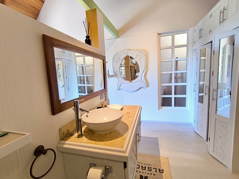 This extraordinary property blends Balinese elegance with Costa Rican beauty, offering distinct living spaces across multiple pavilions. The main pavilion features an open-plan kitchen, dining, and lounge with soaring exotic wood ceilings and floor-to-ceiling glass walls that merge the home with its lush tropical gardens.