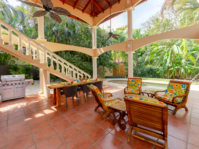 High-ceilinged outdoor dining and entertainment space. A nice-sized pool surrounded by a lush yard and garden. Outdoor kitchenette, bar, and grill area—perfect for hosting gatherings.