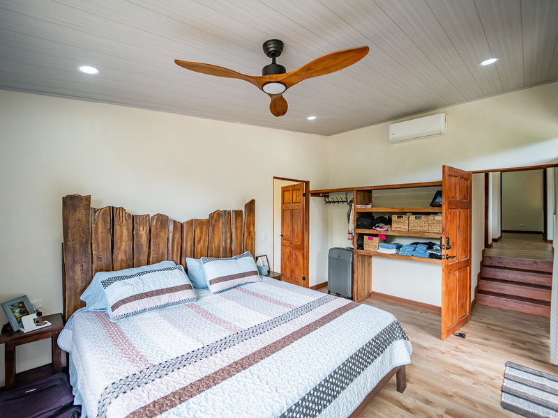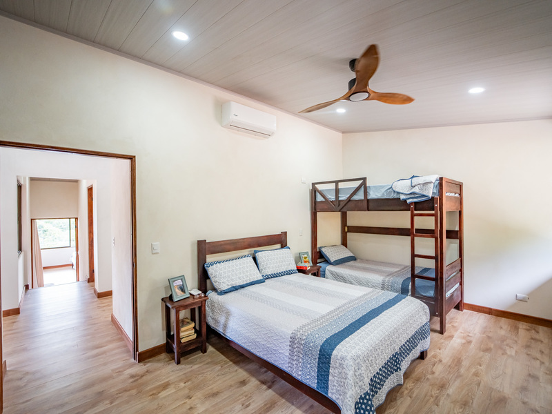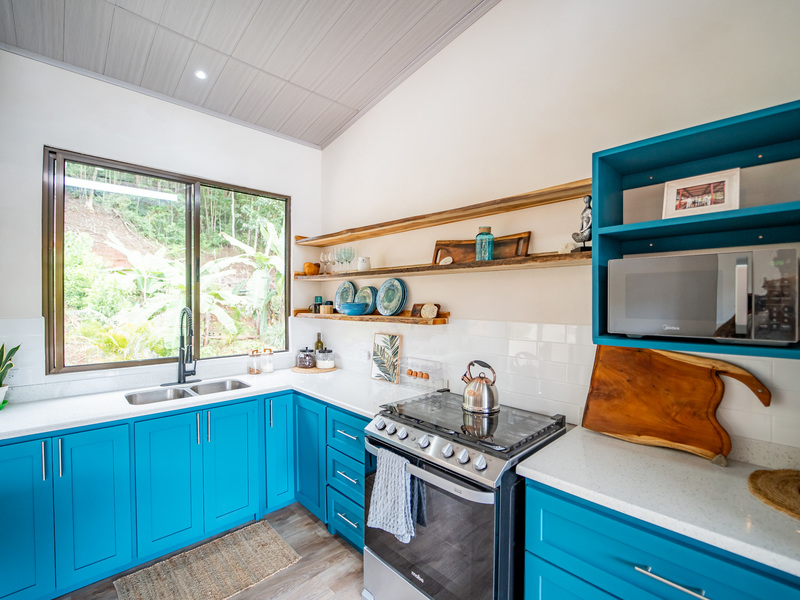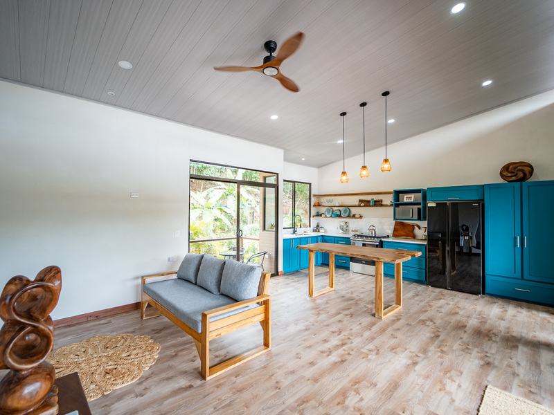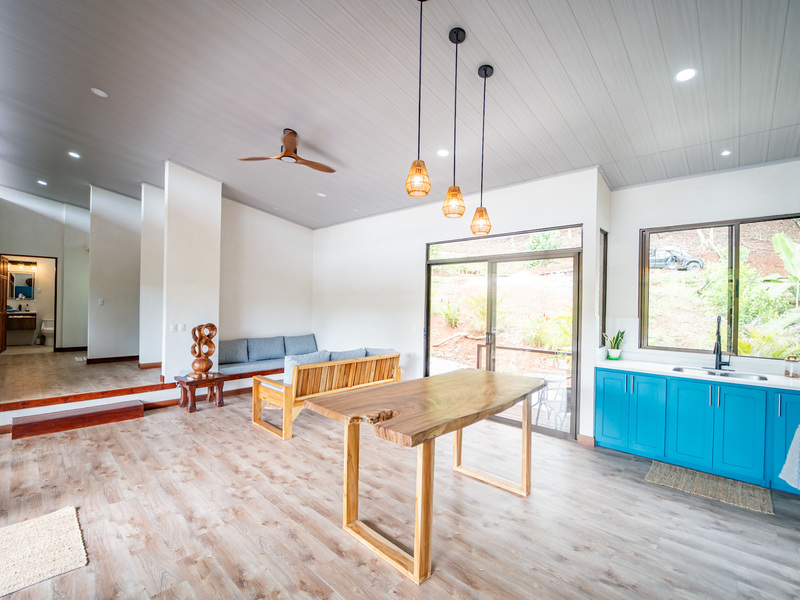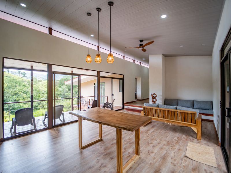 Inside, large glass panels flood the home with light and frame the mountain backdrop. The open layout connects the living area with a custom kitchen finished in granite countertops, a six-burner gas stove, and handcrafted Melina and teak shelving. Instead of a fixed island, a beautiful Guanacaste wood dining table anchors the space, adding flexibility and character.