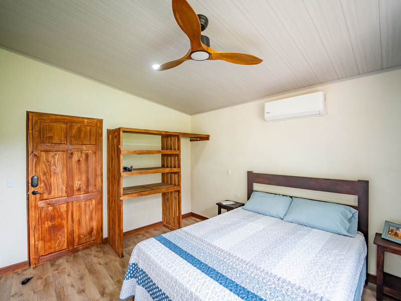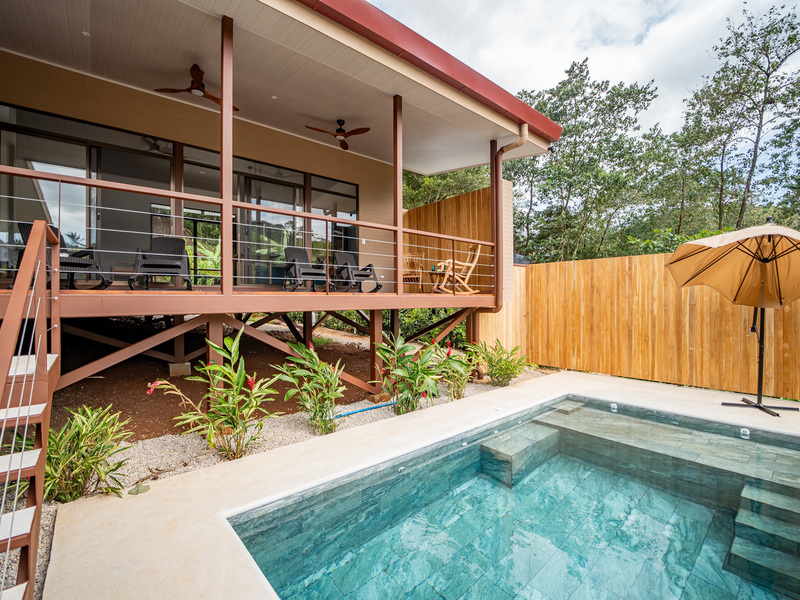 Casa Melina features three bedrooms and two bathrooms across approximately 164 square meters of indoor and outdoor living space. Locally sourced Melina wood, harvested from the property, is featured throughout — from the floors and shelving to the custom-built beds — giving the home a warm, organic feel that reflects its surroundings.