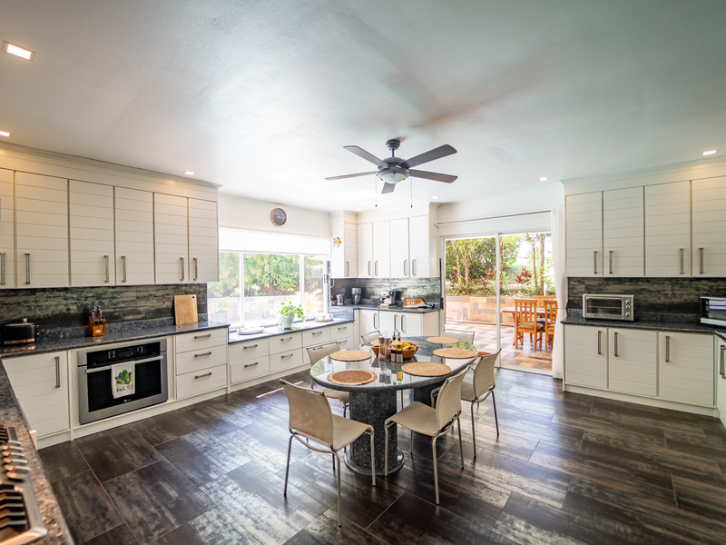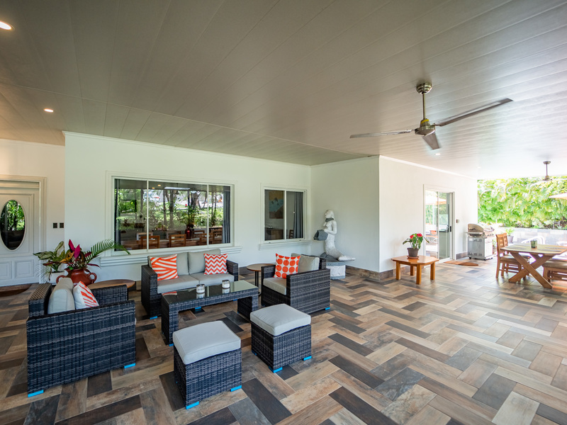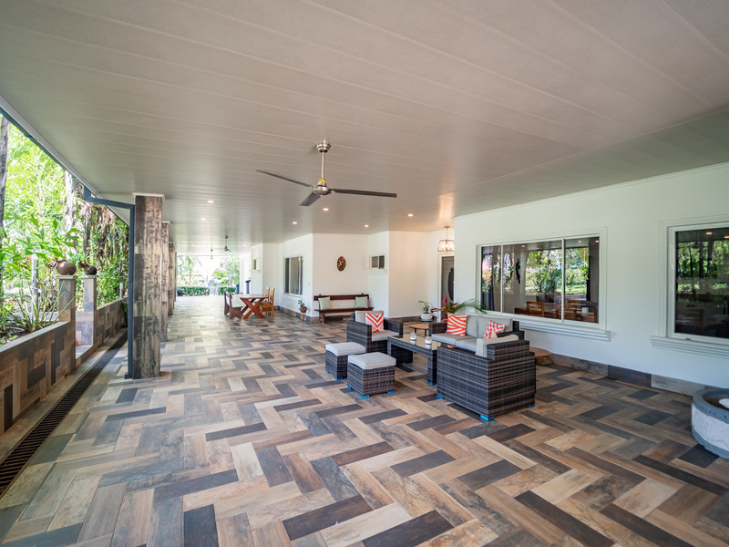 A highlight of the property is a covered patio that stretches the length of the house, doubling the living space and providing the perfect setting for enjoying the lush landscaping. It leads directly to additional patio areas on the side of the house, surrounding the private pool and dining area.