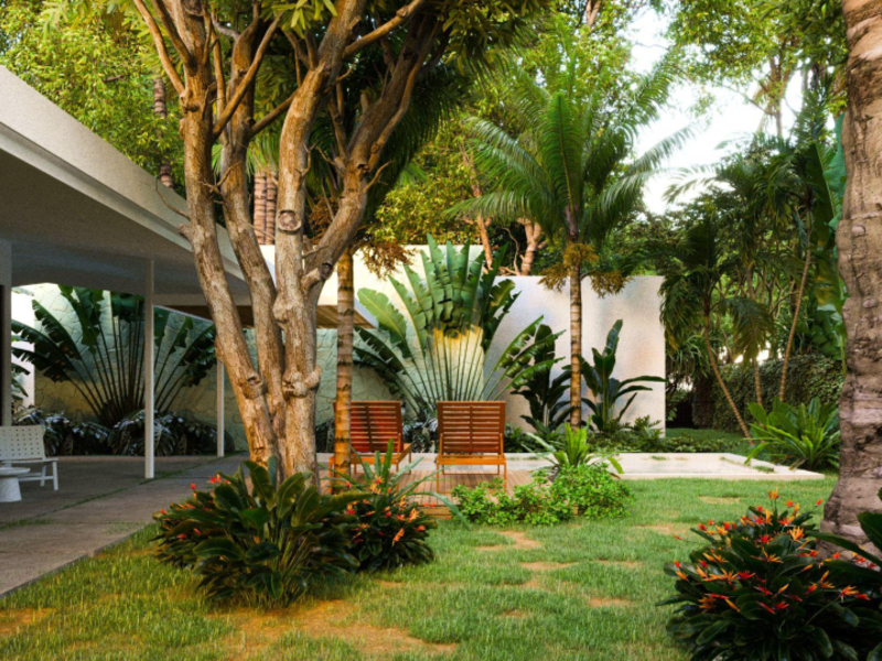 The property features three bedrooms and three and a half bathrooms, along with a separate guest house that can be used for visitors, rental income, or a private office. The layout emphasizes comfort and flow, with open living, dining, and kitchen areas that connect effortlessly to multiple covered terraces. A private pool and sun deck anchor the outdoor living spaces, creating an ideal setting for entertaining or relaxing in the tropical climate.