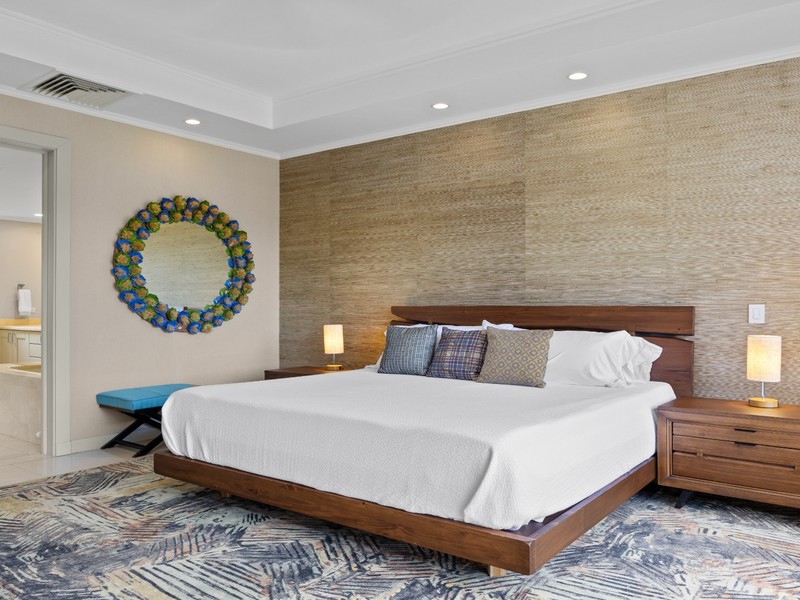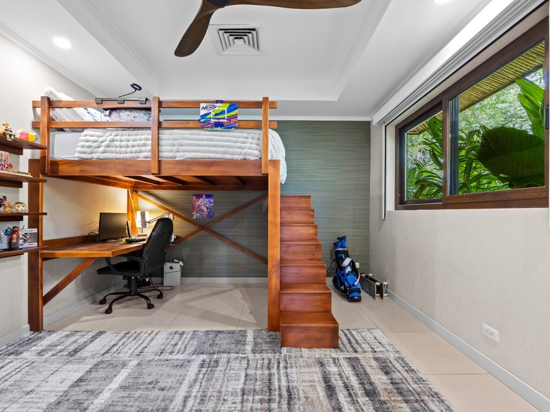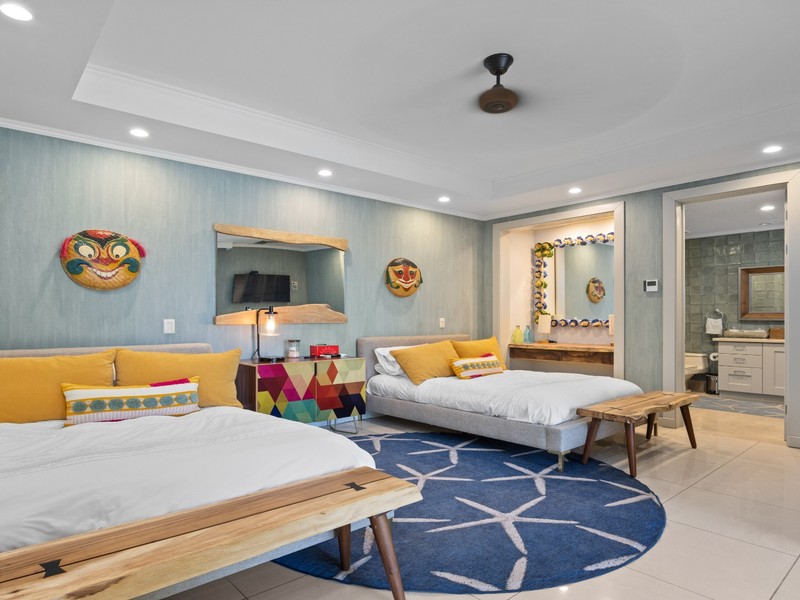 The villa’s private bedroom suites are designed for comfort and style. The primary suite on the main level includes a king bed, oversized walk-in closet, private terrace, and a spa-style bath with skylit shower and two-person Jacuzzi. The second main-level bedroom features a loft bed, desk, and garden views. The lower level includes a guest suite with two queen beds, a sleeper sofa, and terrace access, as well as a fourth bedroom/office with poolside access and en-suite bath.