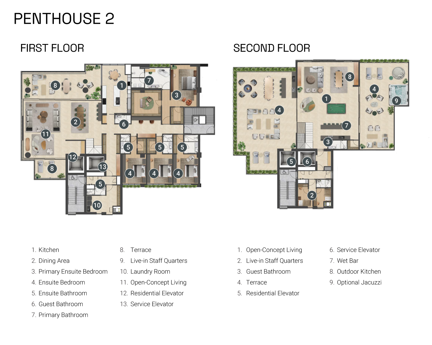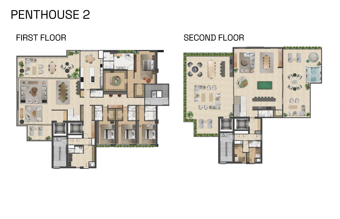 Penthouse 2 unfolds across two expansive levels, each designed to serve a distinct purpose while maintaining a seamless flow between indoor and outdoor spaces.