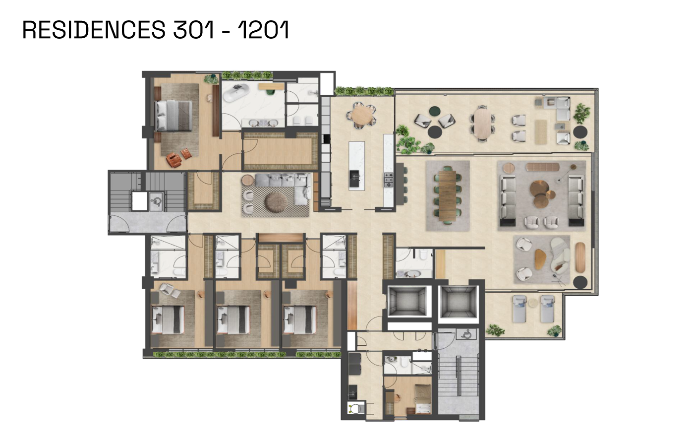 Residences 301 through 1201 at Arcadia Central Park represent the development’s south-facing “01” residences, thoughtfully designed to combine sophistication, privacy, and natural tranquility. These homes enjoy 270-degree panoramic mountain views, abundant natural light, and dual private terraces that enhance indoor–outdoor living within Central Park Escazú.