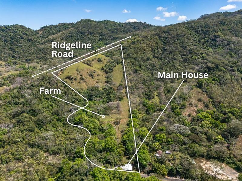 The property has a recently remodeled 4-bedroom farmhouse, as well as excellent sites for building one or two additional houses or cabins. The property borders a paved road that allows quick, 10-minute access by car to the heart of the town of Hojancha. Another public road borders the upper portion of the farm. The property is connected to the public electricity grid and to potable water from the local community water board. Water from a spring and a creek that flows through the land year-round is also available.