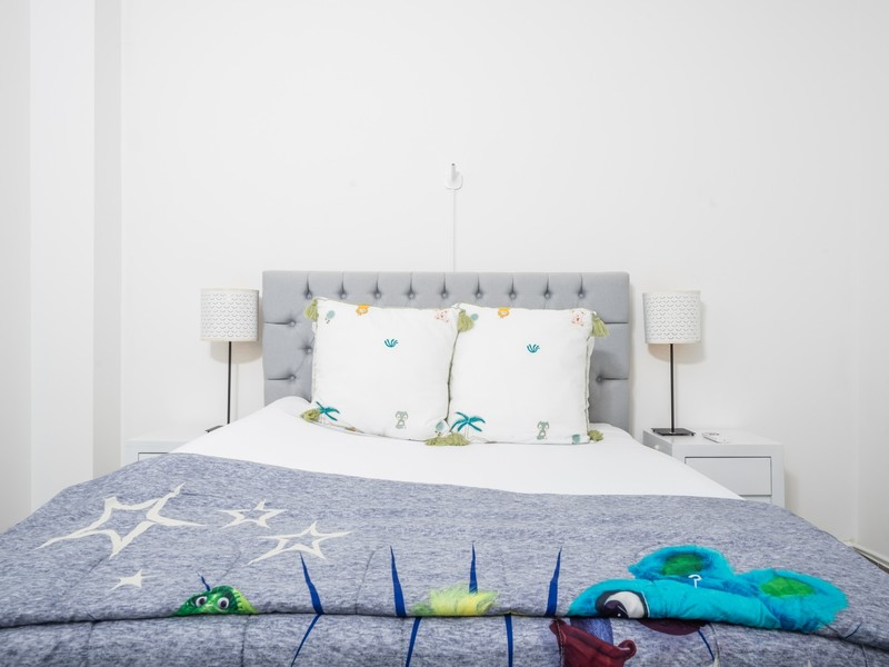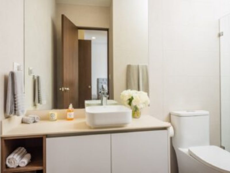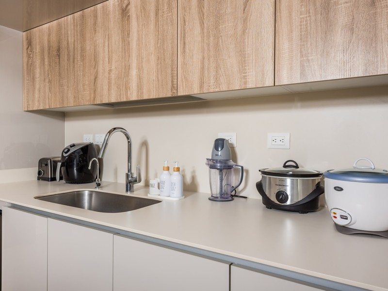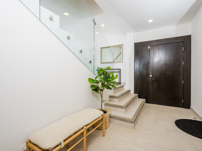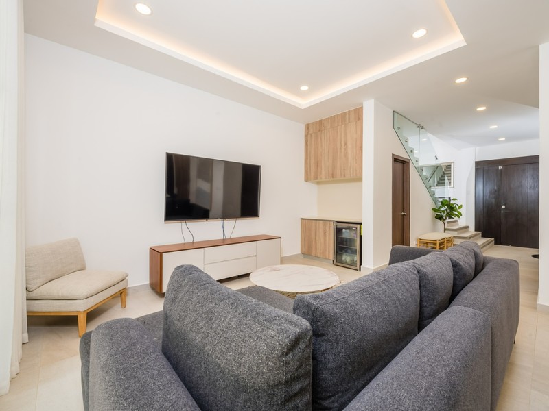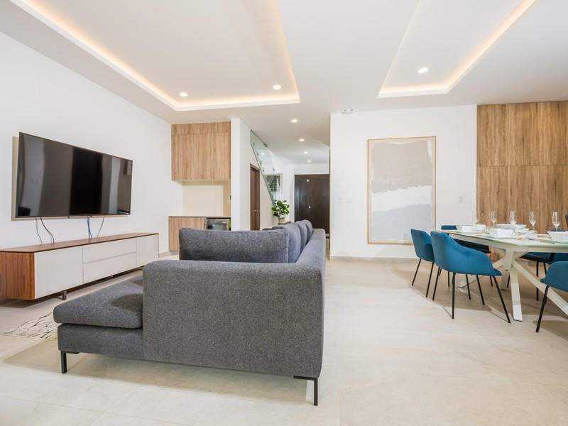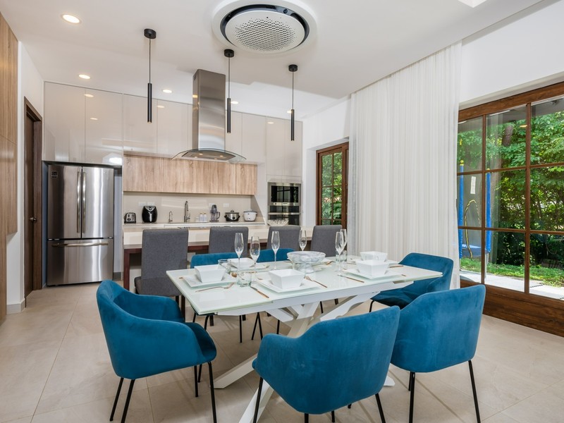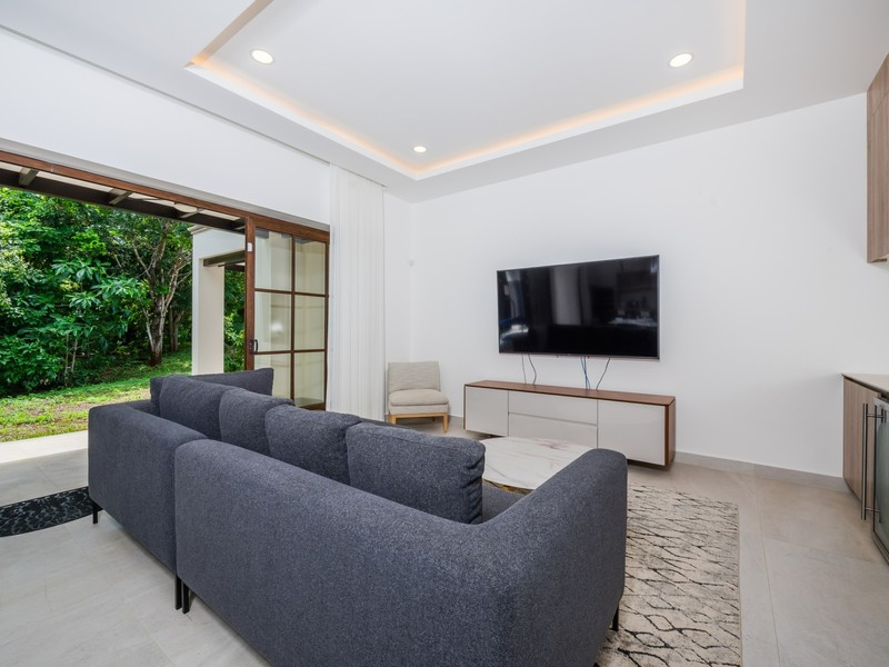 Inside, the home opens to a bright, open-concept living and dining area finished in a calm, neutral palette that enhances natural light throughout. Large sliding glass doors connect the interior seamlessly to the lush garden surroundings, allowing the outdoors to flow effortlessly into the living spaces. The dining area is thoughtfully arranged for hosting family and guests, while the adjacent living room offers a comfortable and welcoming space for everyday living. Recessed lighting and clean ceiling details add a refined, modern touch.