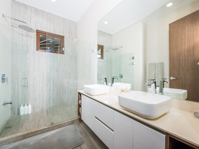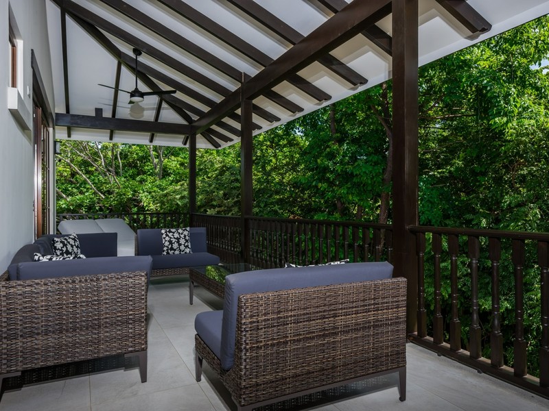 The residence features a striking exterior defined by clean white façades, rich dark wood accents, and expansive covered terraces on both levels. Wide roof overhangs and shaded outdoor living spaces highlight the home’s indoor–outdoor design, creating inviting areas for entertaining or relaxing in the warm coastal climate. Manicured landscaping, flowering plants, and mature trees frame the property, providing privacy and a serene tropical setting.