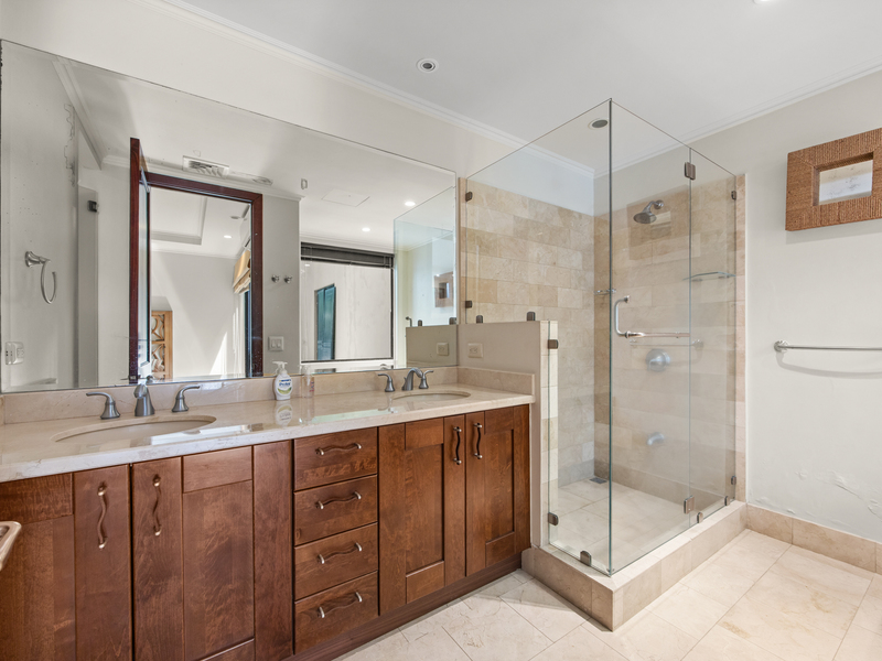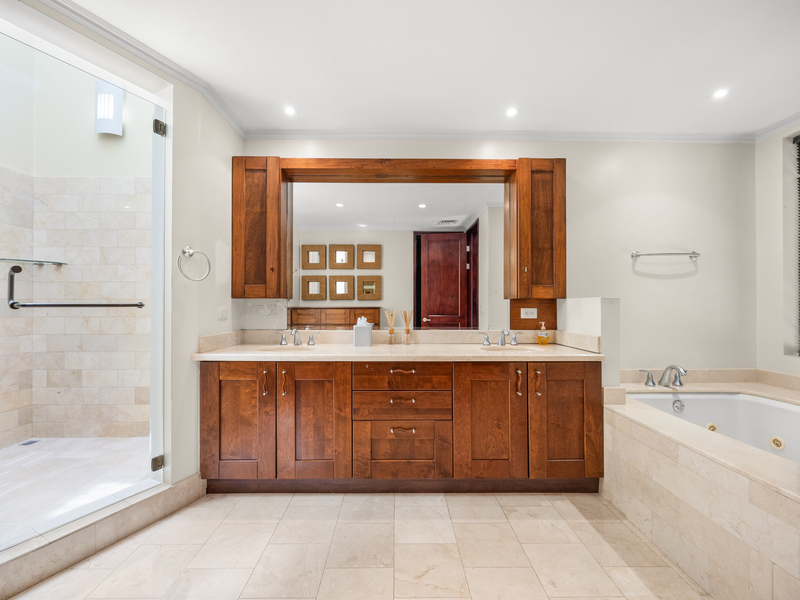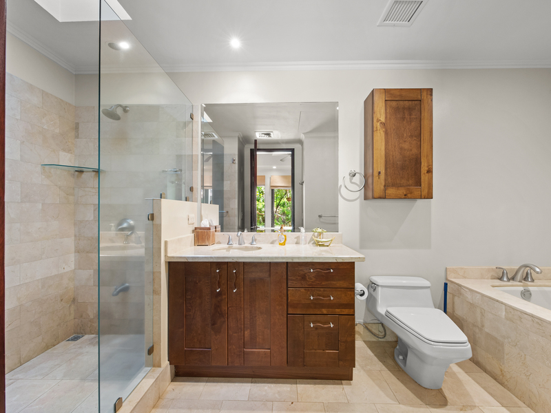 Each of the four bedrooms includes its own bathroom, providing privacy and comfort for all. The primary suite features a large bathroom with a jacuzzi tub, a skylight shower, a walk-in closet, and a private terrace overlooking the golf course—a peaceful spot to start your day.