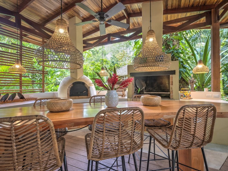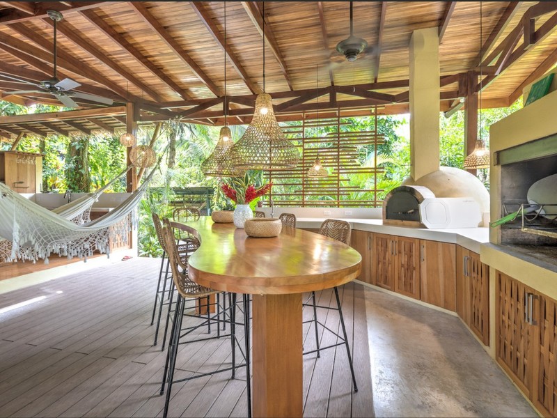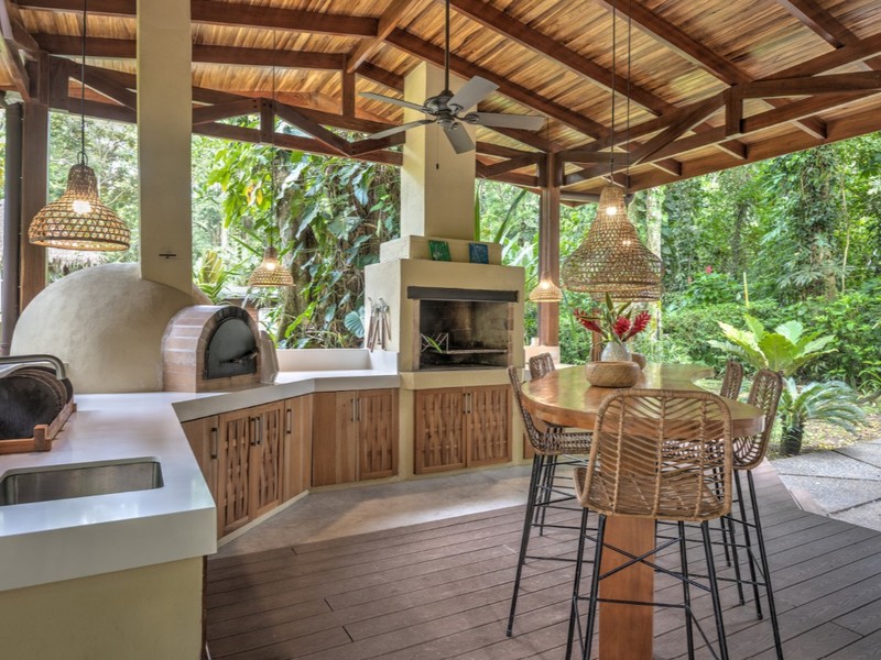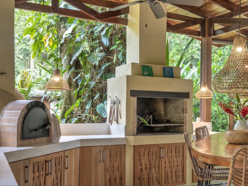 - Outdoor Kitchen: Features a traditional wood-fired pizza oven, barbecue grill, kitchen island, and cozy seating area, ideal for entertaining guests under the stars.