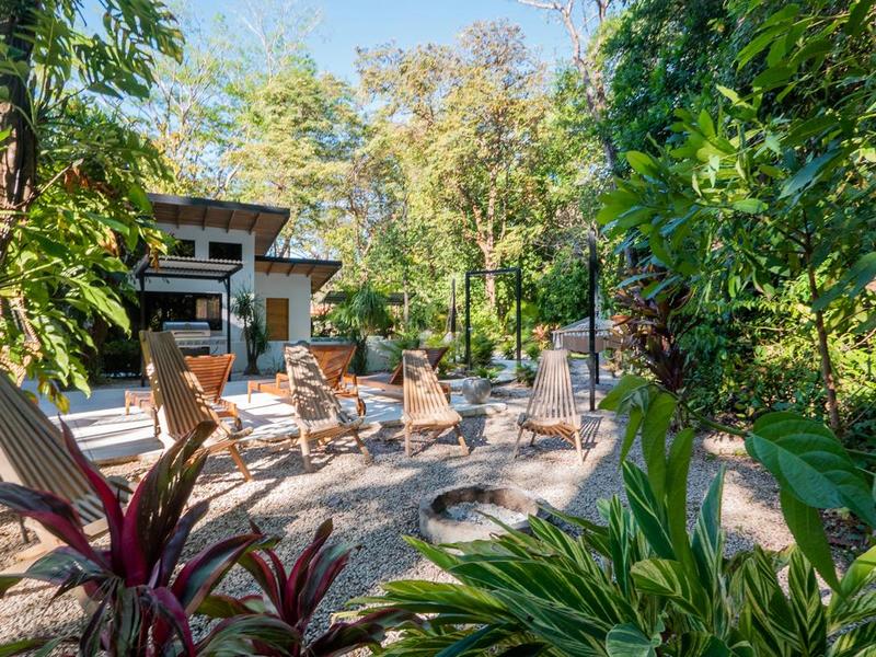 Outside, the real adventure begins. A winding garden path leads past a shimmering pool, a crackling fire pit, and hidden spots to lounge under the trees. The river murmurs at the edge of the property, keeping the world at bay while monkeys and parrots provide the morning show.