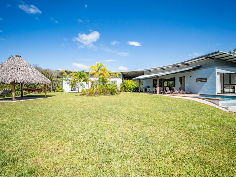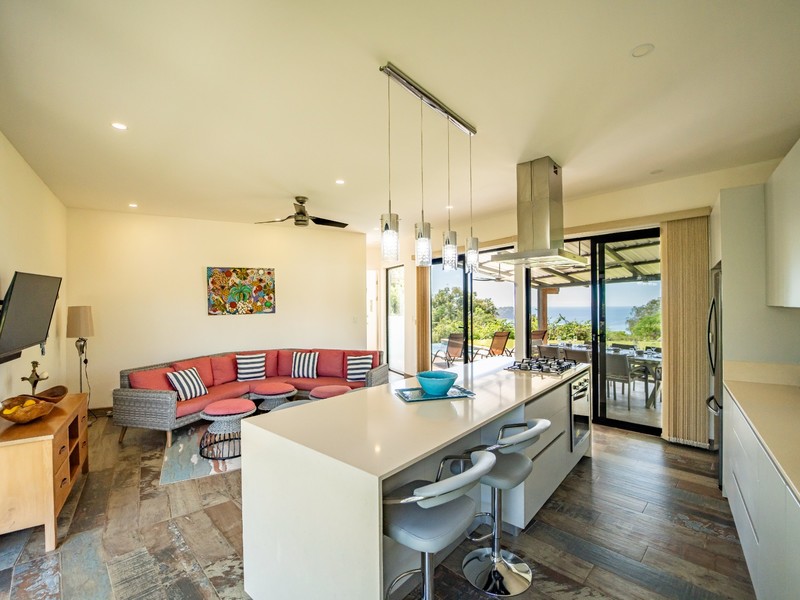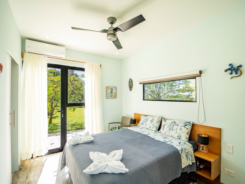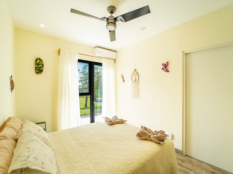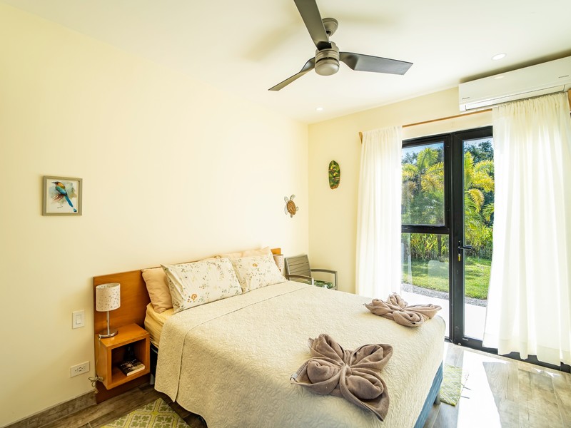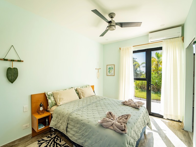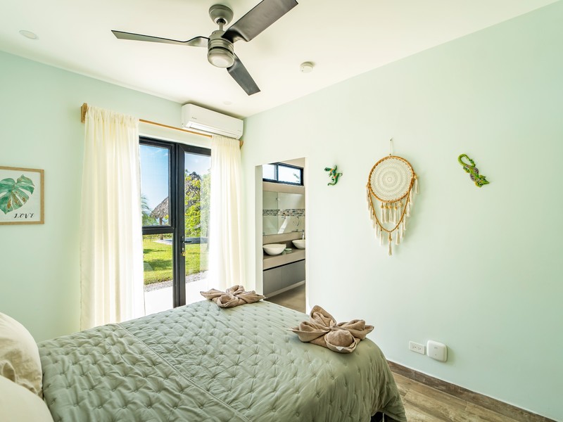 Master Suite: The spacious master bedroom includes air conditioning, a ceiling fan, and a luxurious en-suite bathroom. A fully glazed wall offers stunning views of the garden and ocean.