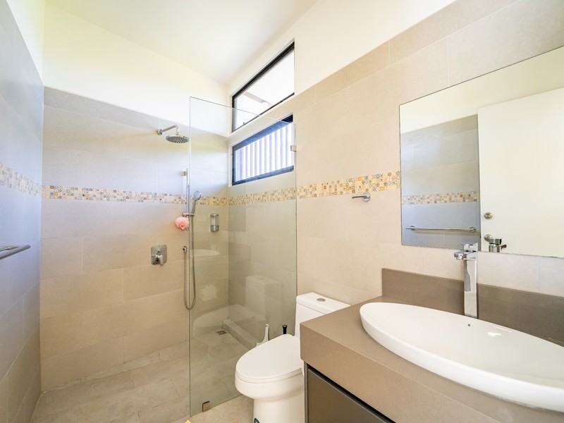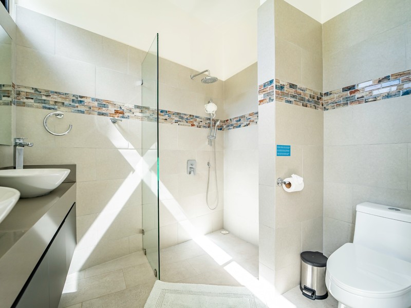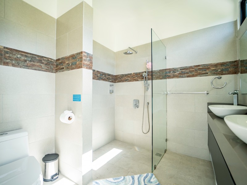 Three Additional Bedrooms: Each bedroom features air conditioning, ceiling fans, and an en-suite bathroom. French windows open to the garden, ensuring privacy and natural light.