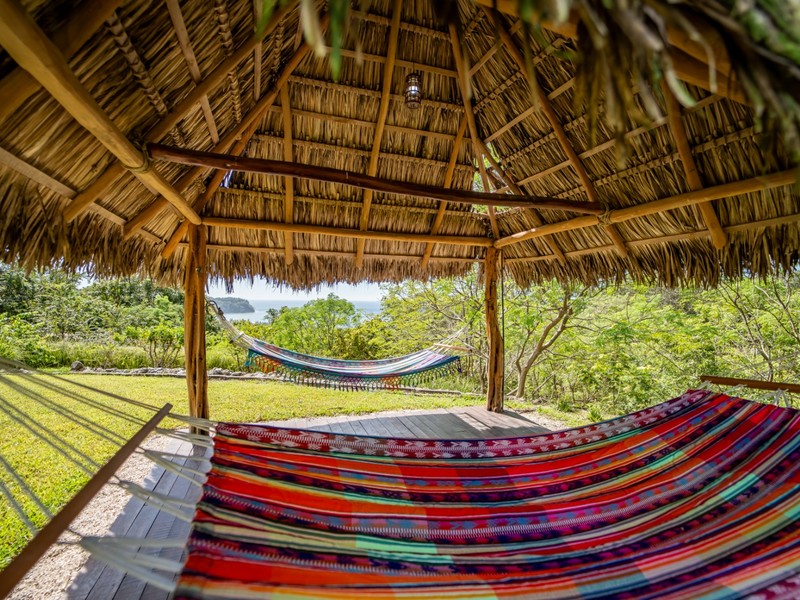 Rancho with Hammocks: Unwind in the shade of the palm-roofed rancho, perfect for taking in the panoramic views of the Pacific Ocean and Isla Chora.