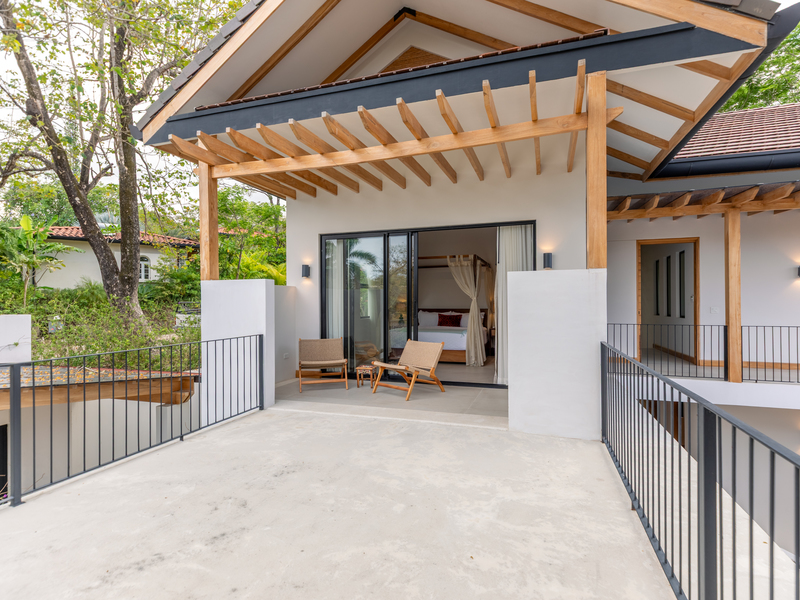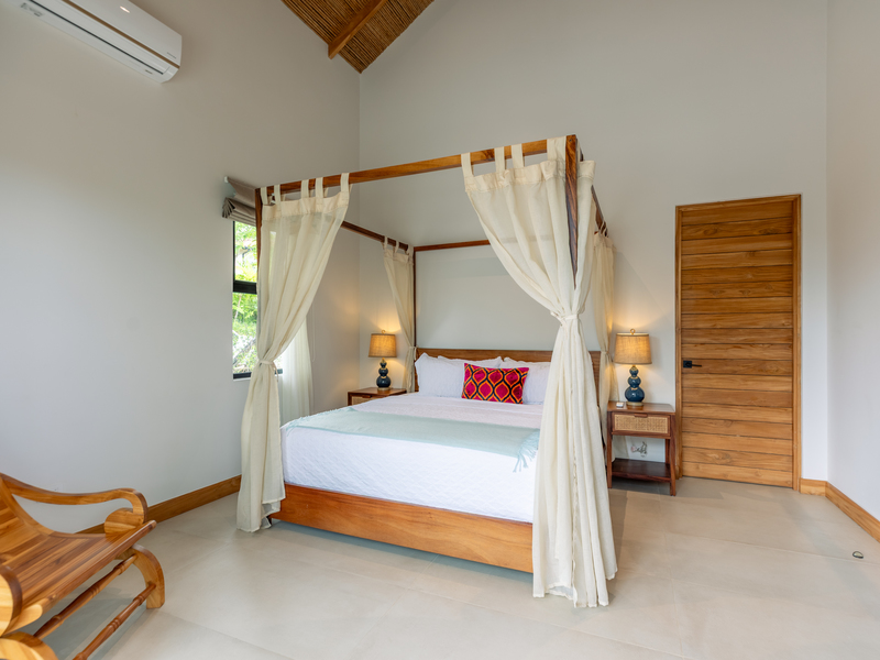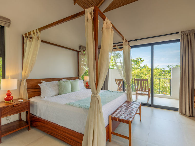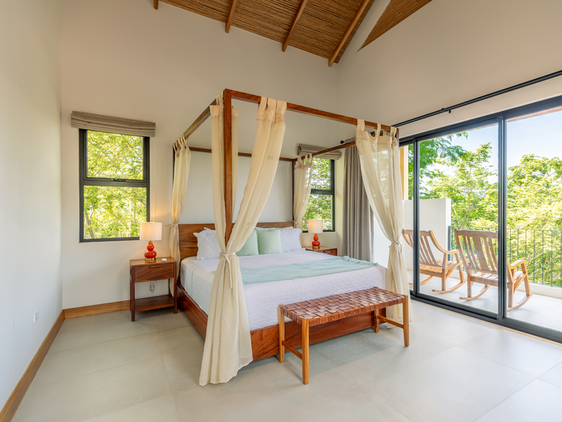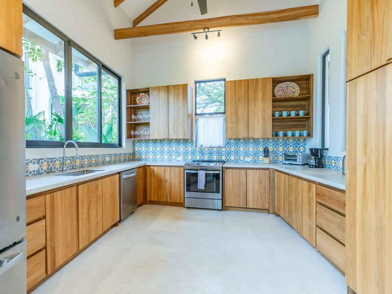 The open-air central seating area provides a perfect vantage point for enjoying the panoramic views of the pool, wildlife, and the soothing sounds of the ocean. Adjacent to it, a generous Guanacaste dining table, seating eight, offers an idyllic setting for communal meals. Please note that the kitchen and dinning area are separate from the bedrooms, it is an open concept Mediterranean House.