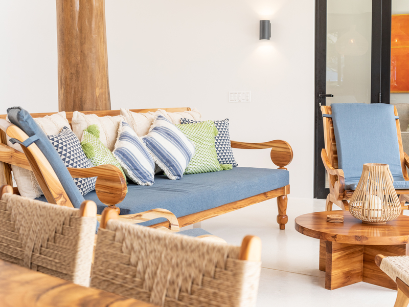 The modern, fully stocked kitchen is designed for culinary enthusiasts and is well-suited for both self-cooked meals and the services of a private chef. The furnishings, predominantly custom-made, showcase the rich beauty of locally harvested wood from Costa Rica, adding a touch of authenticity to the contemporary design.