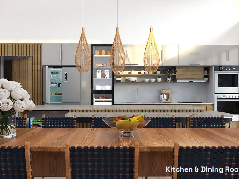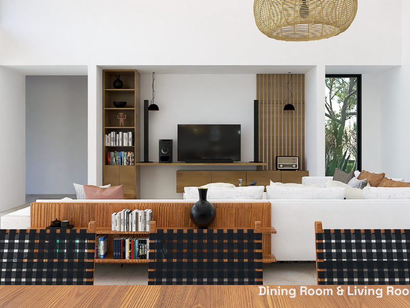 Inside, soaring double-height ceilings and expansive glass walls flood the interiors with natural light, creating a bright, open ambiance throughout. The open-concept living and dining areas flow effortlessly into the kitchen, pantry, and ample storage spaces, balancing sophisticated aesthetics with everyday functionality.