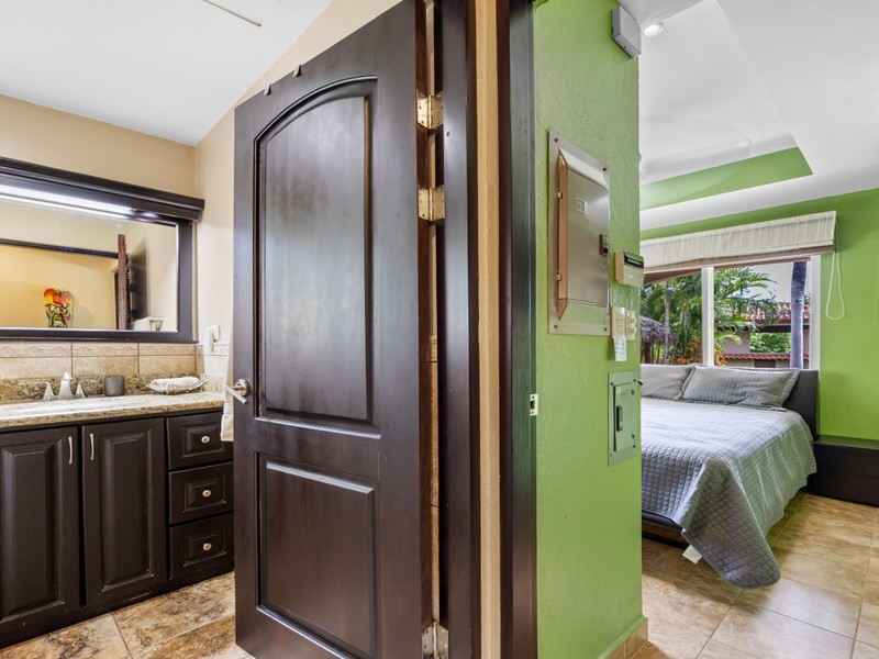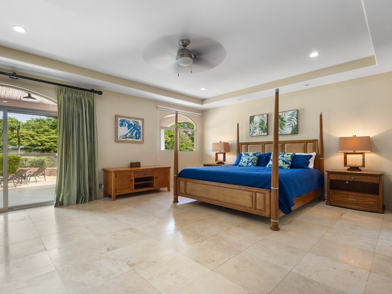 Two lavish primary suites, each with spa-style bathrooms, private sitting areas, and direct pool access