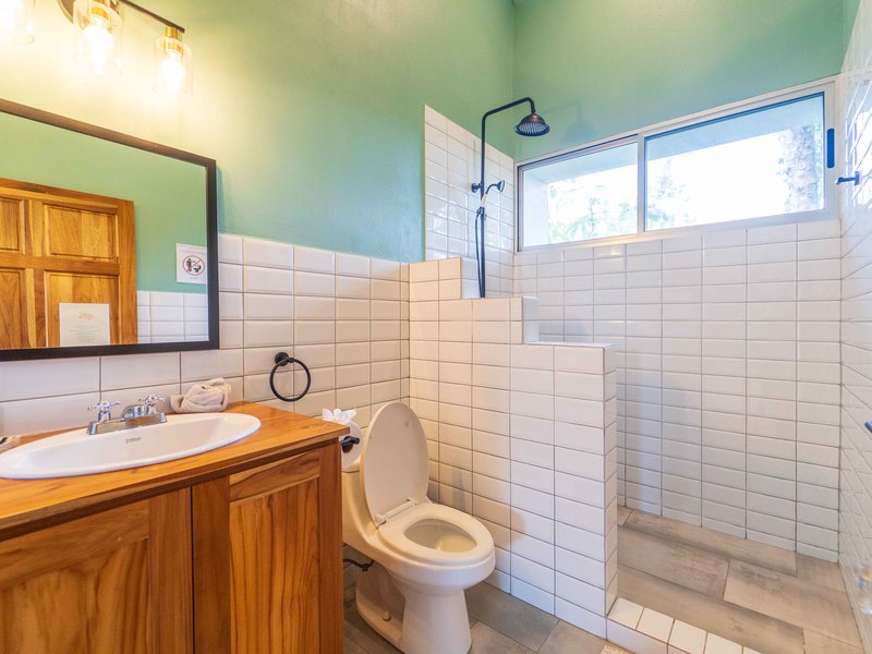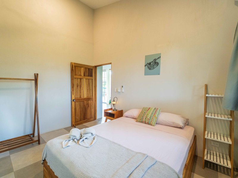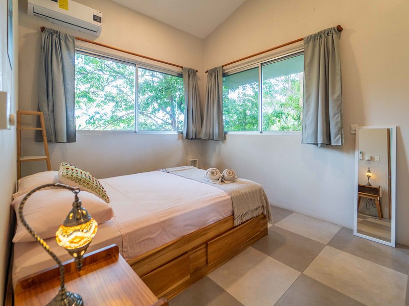 The upper level hosts two more bedrooms—one with a king bed and the other with twin beds—both opening onto a large balcony with jungle and mountain views. These bedrooms share a well-appointed full bathroom, making the space ideal for families or groups.