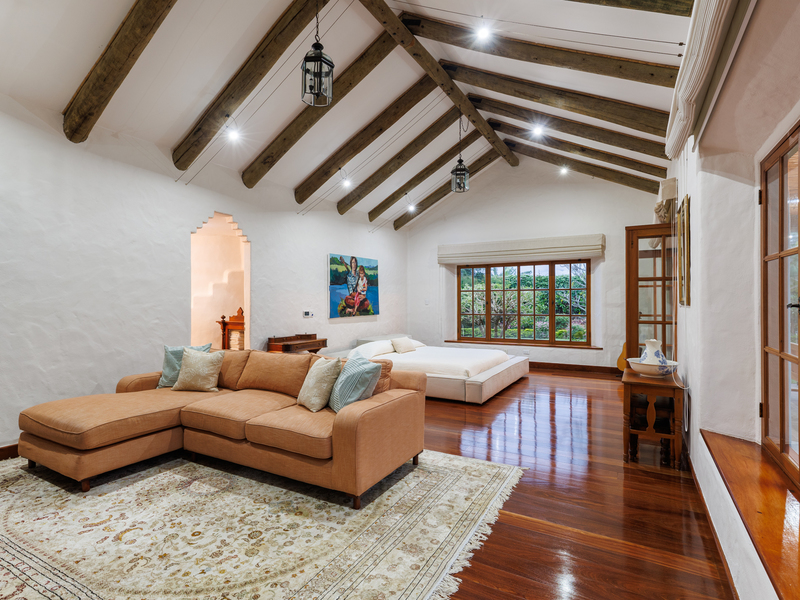 The home welcomes with a generous entrance hall that leads into integrated living and dining areas, designed to flow seamlessly with the outdoors. A central patio with a Mexican fountain brings natural light and tranquility into the heart of the house, while a large terracefully enclosed with glass panelsextends from the living room and master suite, offering a year-round connection to the gardens. The kitchen, pantry, and laundry module are arranged for ease and functionality, supported by ample storage throughout.