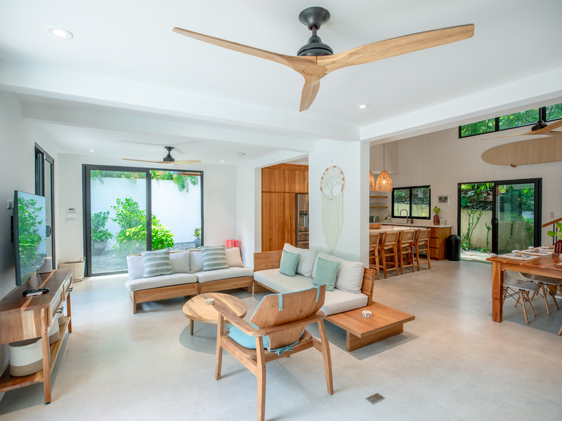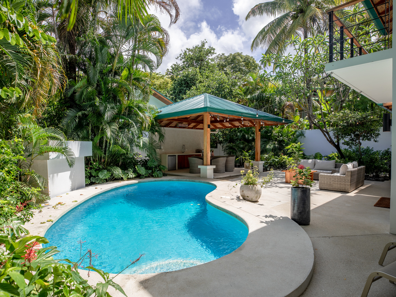 Tucked within the gated community of Guiones Beach Club is Casa Bella Mar. This 5 bedroom, 5 1/2 bathroom gem of a house has been beautifully renovated from top to bottom (2023). The open kitchen is a cook's dream with plenty of natural light, soaring ceilings, quartz countertops, a large island with barstool seating and a dining table with room for the family. The living room opens directly to an outdoor paradise where a patio lounge seamlessly connects the house, pool, outdoor shower, and covered rancho complete with gas grill and dining room table for meals al fresco. This villa is fully equipped with A/C.