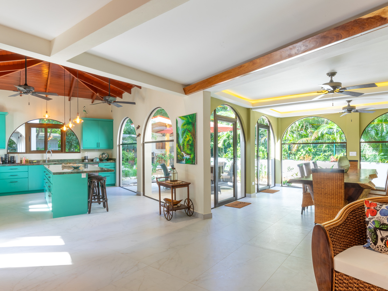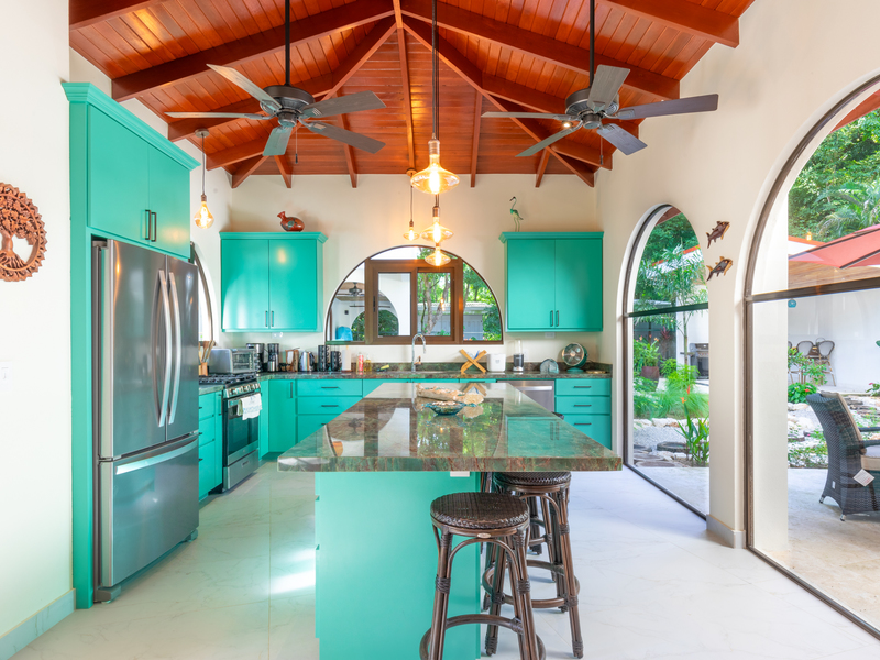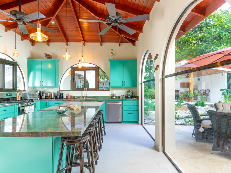 The main house boasts an open-concept living space with vibrant turquoise cabinetry and high vaulted wooden ceilings, creating a warm and inviting atmosphere. Large arched windows frame the lush garden, seamlessly blending indoor and outdoor living.