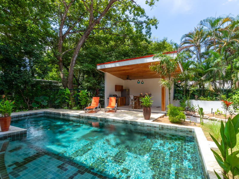 Relax by your private 10 meters long, salt water pool, surrounded by tropical greenery, and dancing humming birds and butterflies. The outdoor BBQ area offers the perfect space to cook delicious meals by the pool and gather with your friends and family.
