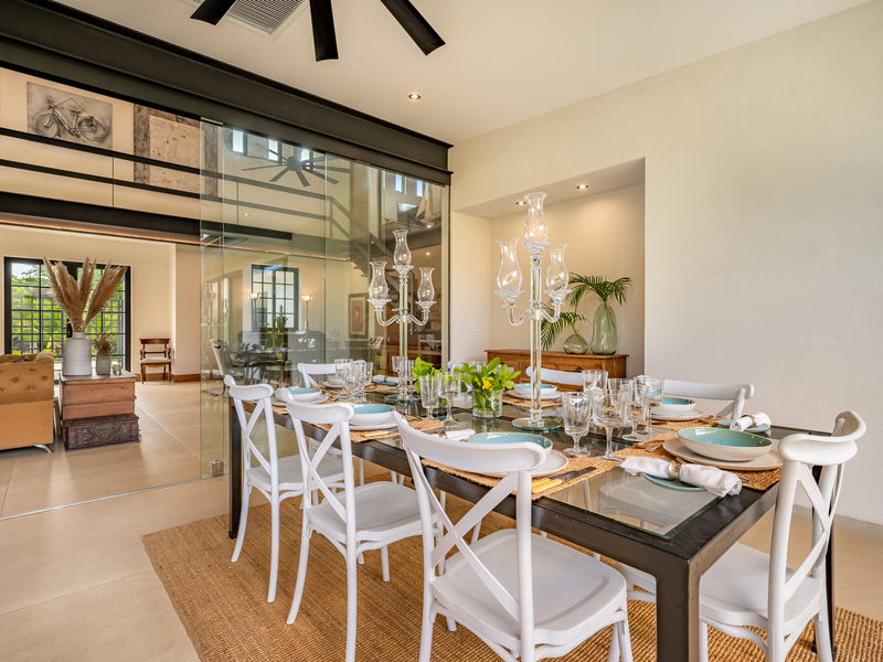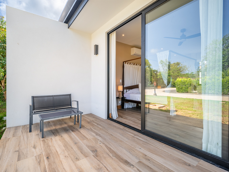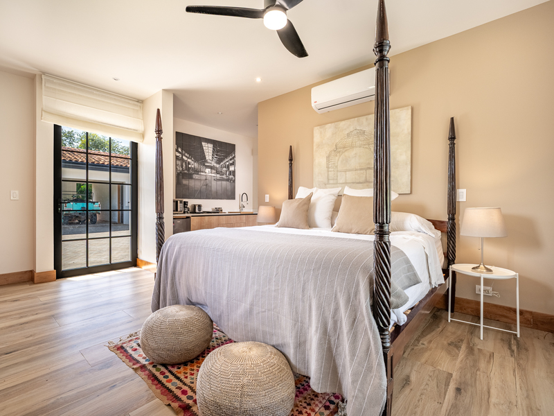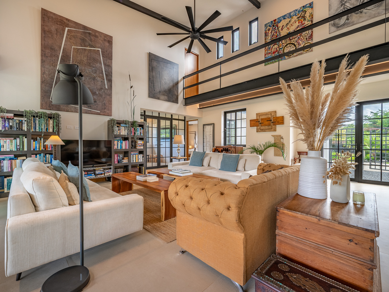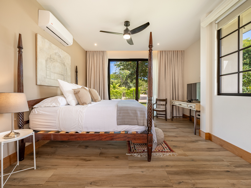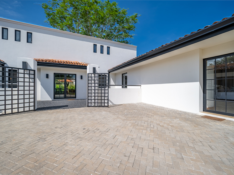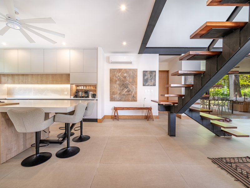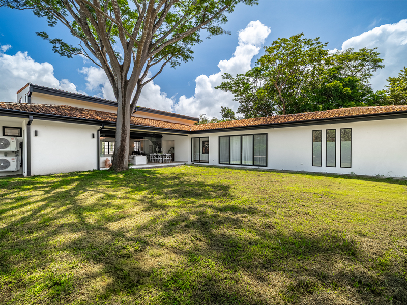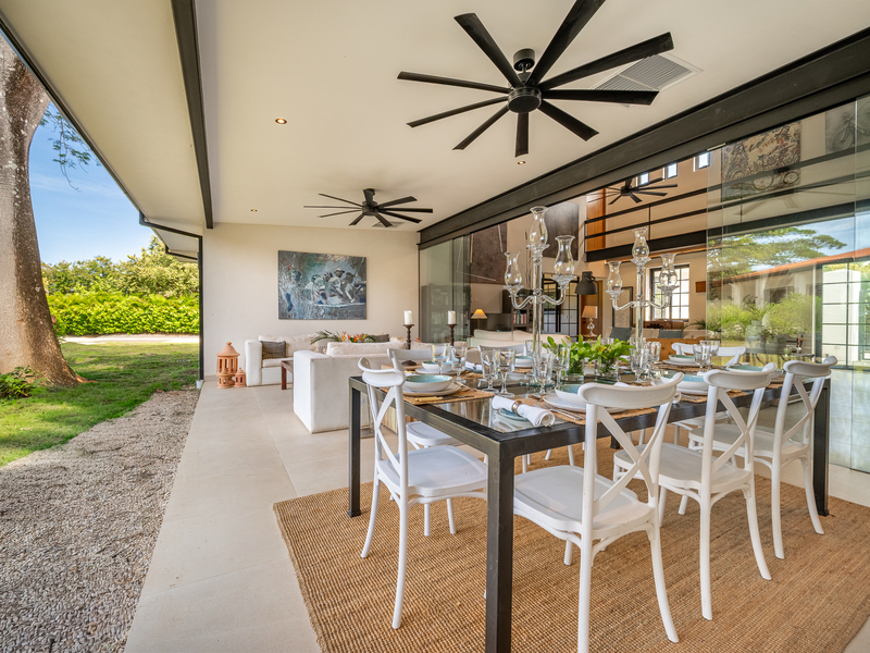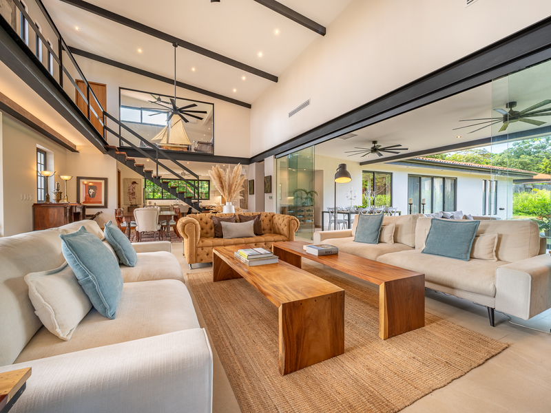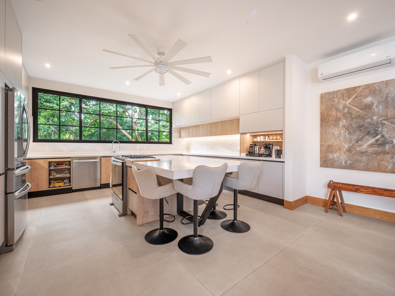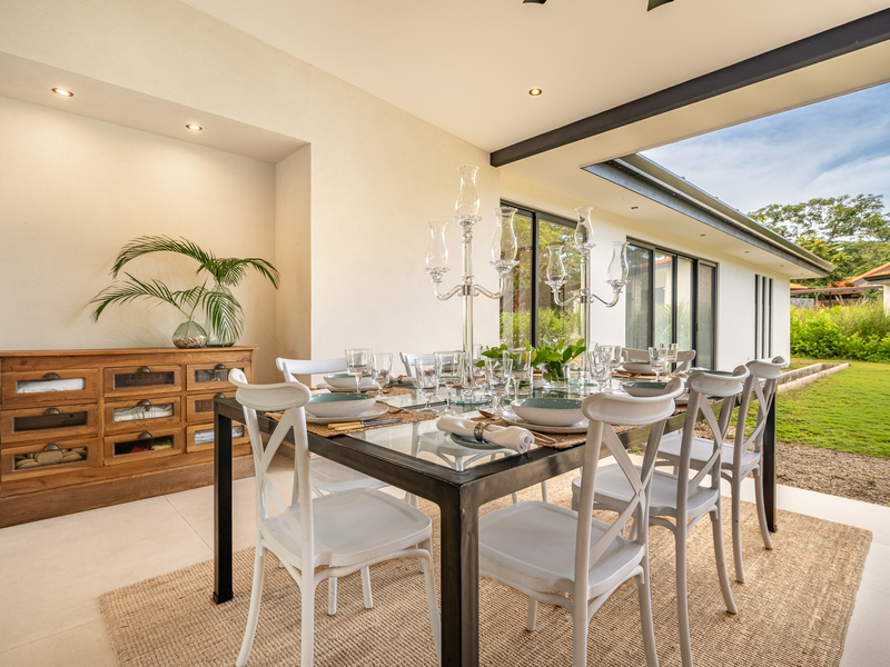 The exterior showcases Mediterranean character, while the interior embraces open, modern living. The chef’s kitchen includes high-end appliances and ample counter space, flowing into a spacious living area with double-height ceilings. Indoor and outdoor dining areas invite both elegant dinners and relaxed gatherings. Outside, a mature tree anchors the patio, adding charm and shade to the terrace—perfect for enjoying Guanacaste’s sunny climate. The property also offers a two-car carport and extra parking.