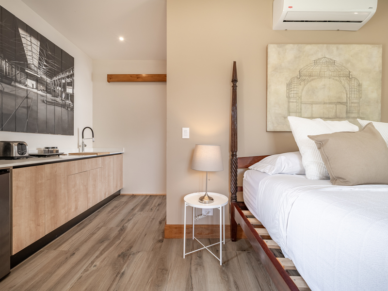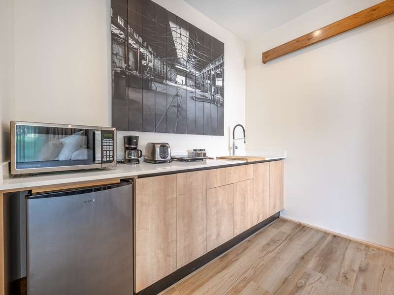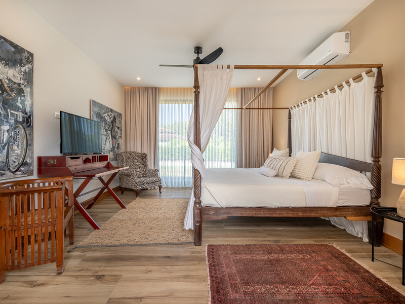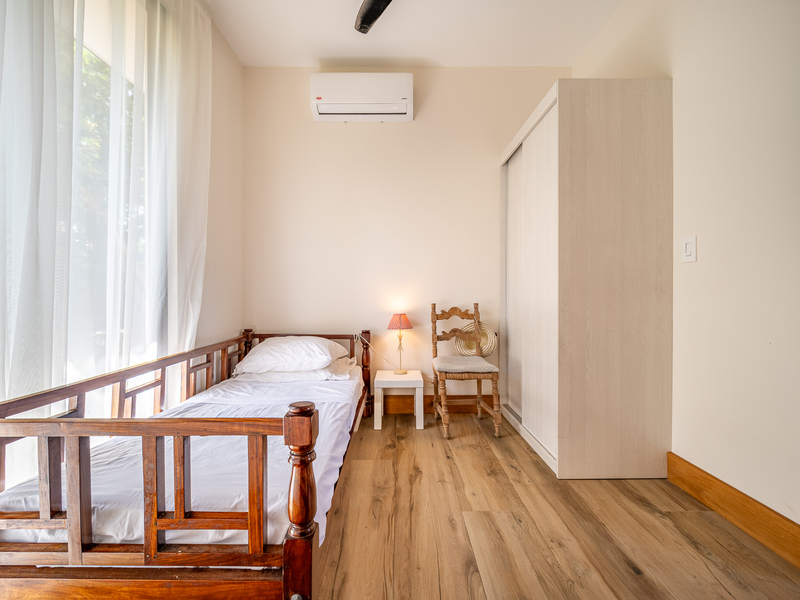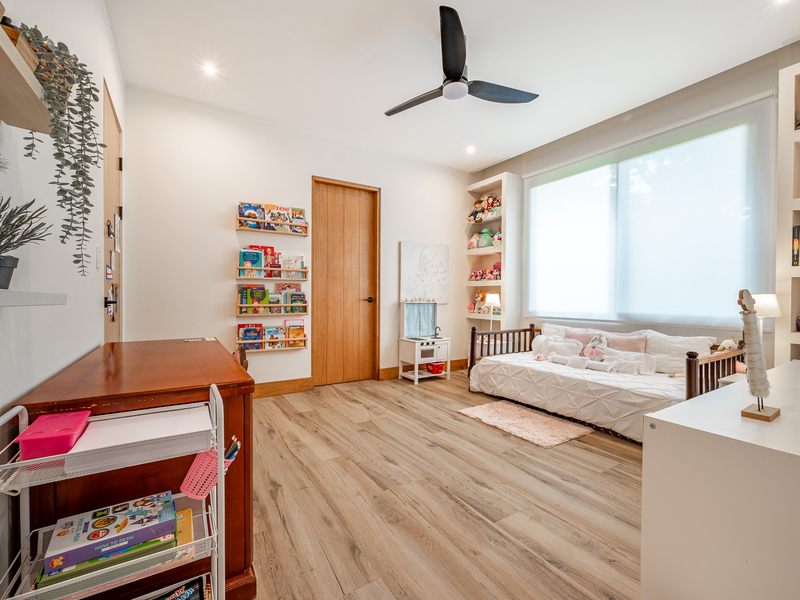 One bedroom is specially designed for children, creating a cheerful and playful space. The home’s design highlights locally sourced wood, including custom bleachers built into the staircase, combining natural warmth with clean, modern lines.
