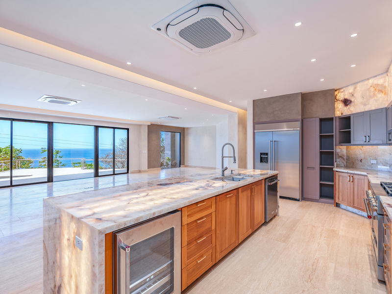 The materials used at El Palacete are exemplary of true luxury builds, without substitution, and no expense was spared. Attractive quartzite was imported from Brazil for backsplashes and counters; the Crystal Mundi slab, used for the kitchen countertop, is transparent, and lighting installed in the counter creates a dazzling spectacle at the center of the home.