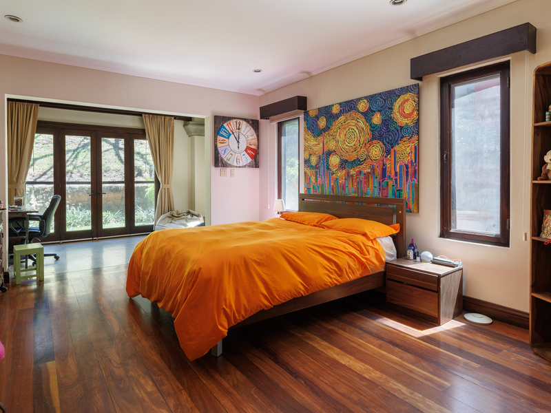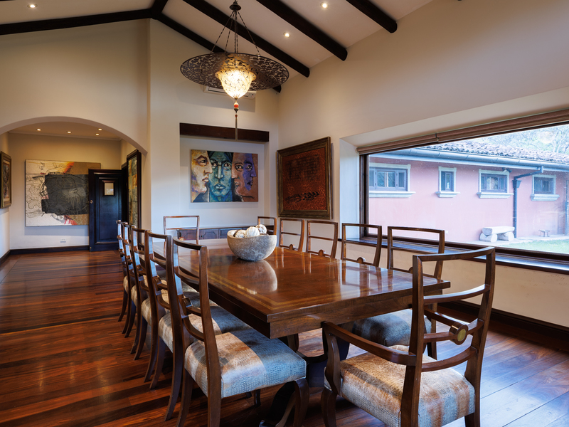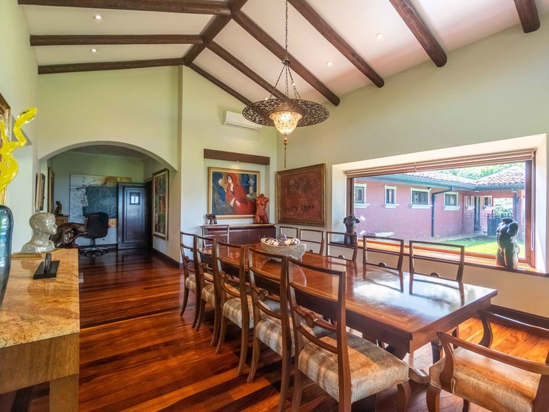 At the heart of the property, a classic swimming pool extends into the landscape, bordered by mature trees, sculpted hedges, and a covered lounge area ideal for year-round enjoyment. The grounds are as functional as they are beautiful, with three staff quarters, ample laundry area, large dog kennels, and covered parking for four vehicles discretely integrated into the layout, plus ample parking areas for guests. The villa also includes its own guard gate with a private bathroom and kitchenette.